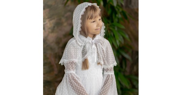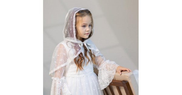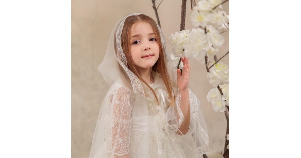 Our elegant caped mantillas are inspired by European Communion traditions. Made with exquisite lace, they drape gently over the shoulders and are perfect for those who seek a more vintage or heirloom-inspired style.
