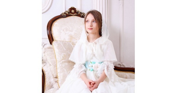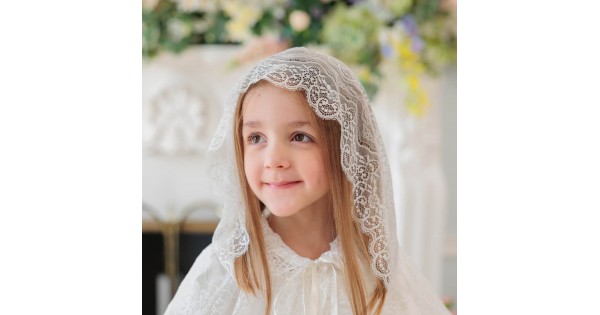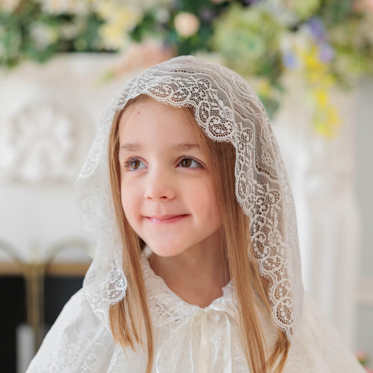 Our elegant caped mantillas are inspired by European Communion traditions. Made with exquisite lace, they drape gently over the shoulders and are perfect for those who seek a more vintage or heirloom-inspired style.