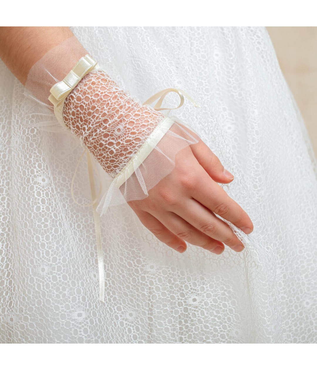Crafted from delicate lace, these gloves are designed to pair perfectly with any Communion dress — adding a refined, classic charm to her special day.The timeless ivory lace complements both traditional and modern styles, while the flexible fit ensures they comfortably adapt to any wrist.