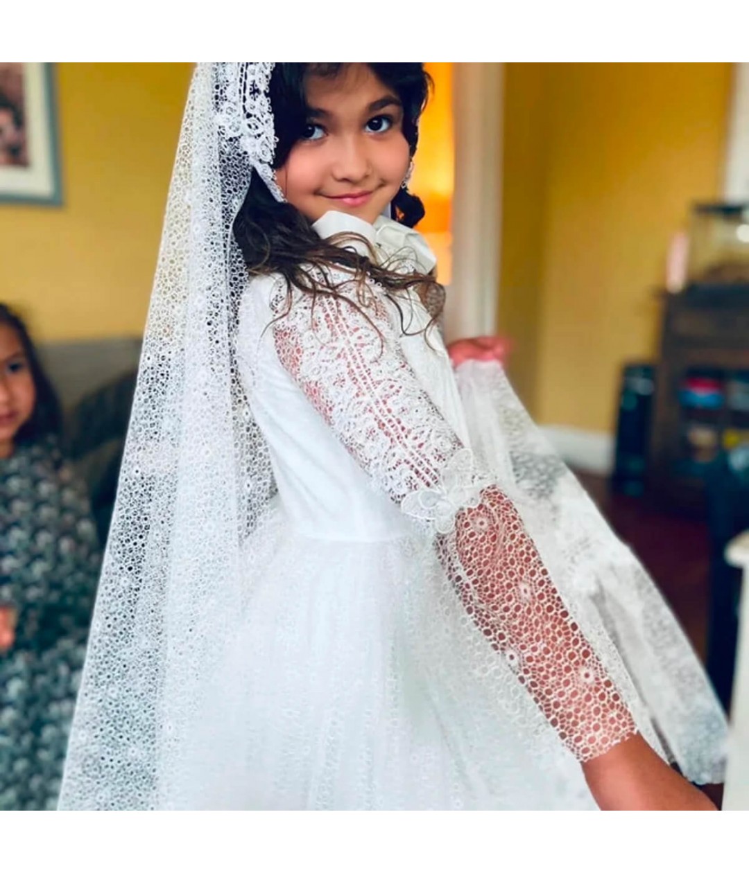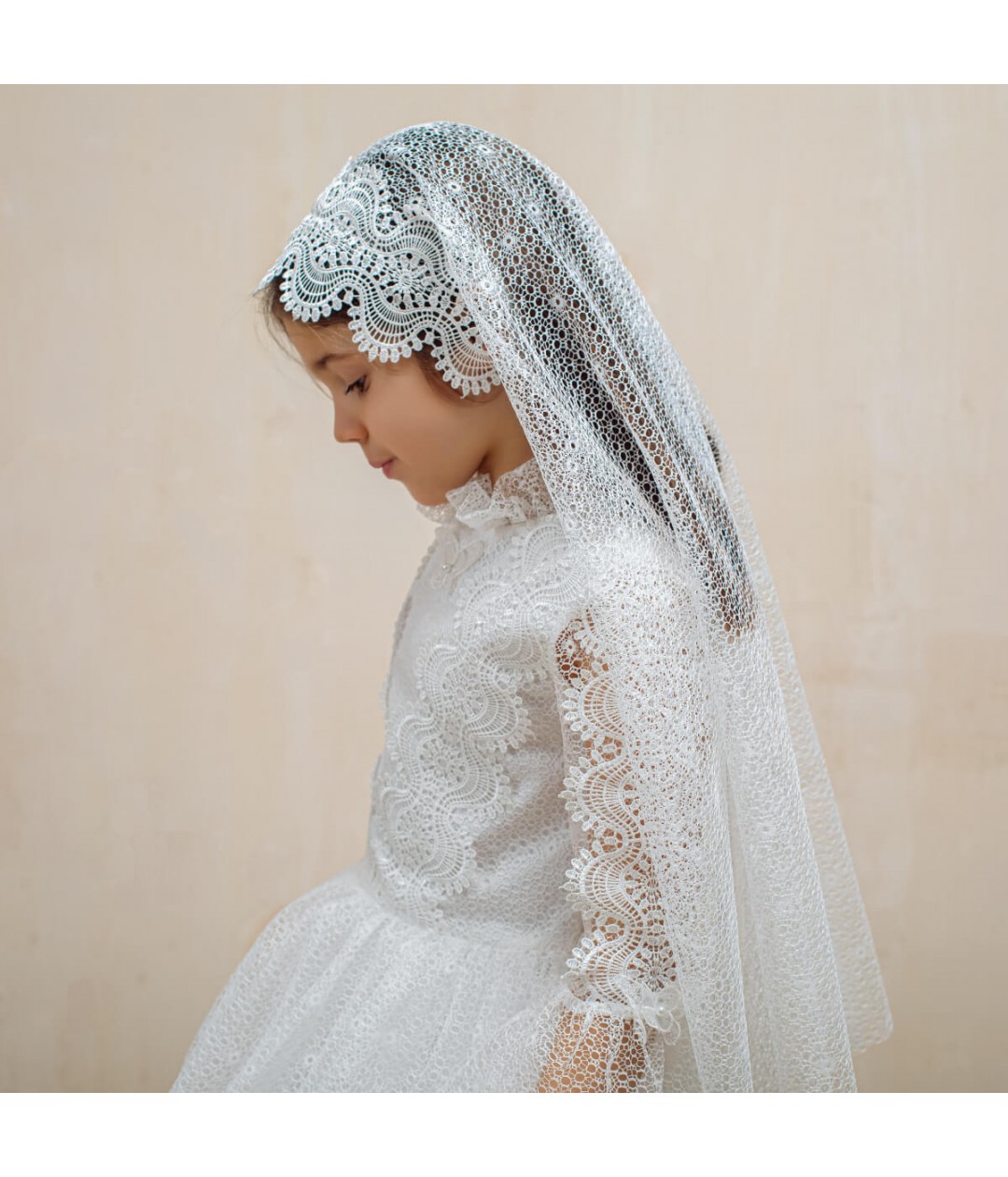 Its gentle ivory tone complements a wide range of First Communion dresses, particularly those in traditional or minimalist styles. Ideal for Catholic ceremonies, this classic veil adds a sacred, heirloom touch to your child’s special day.