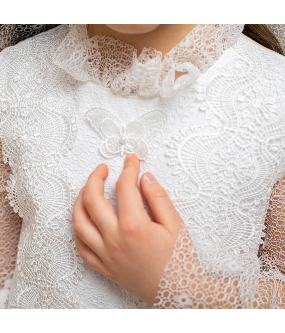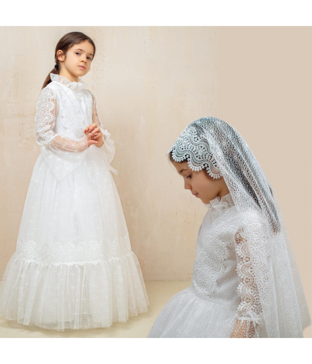 Gracefully crafted for her First Holy Communion, this enchanting lace Communion dress blends tradition with delicate detail. Made from breathable pure cotton and fully lined with soft, thin batiste, it ensures all-day comfort for your little girl.