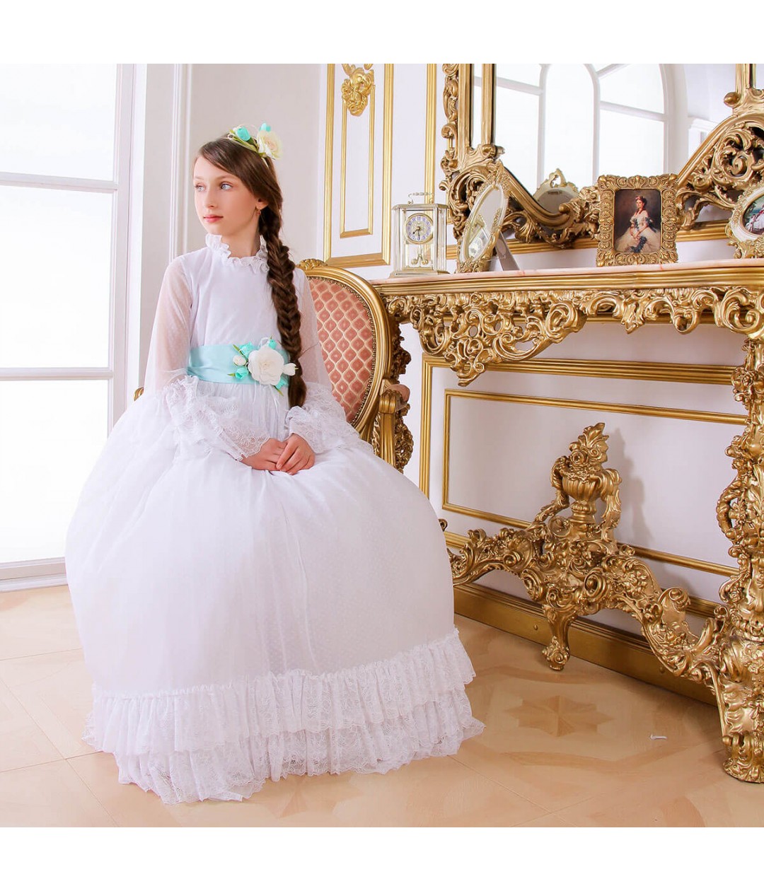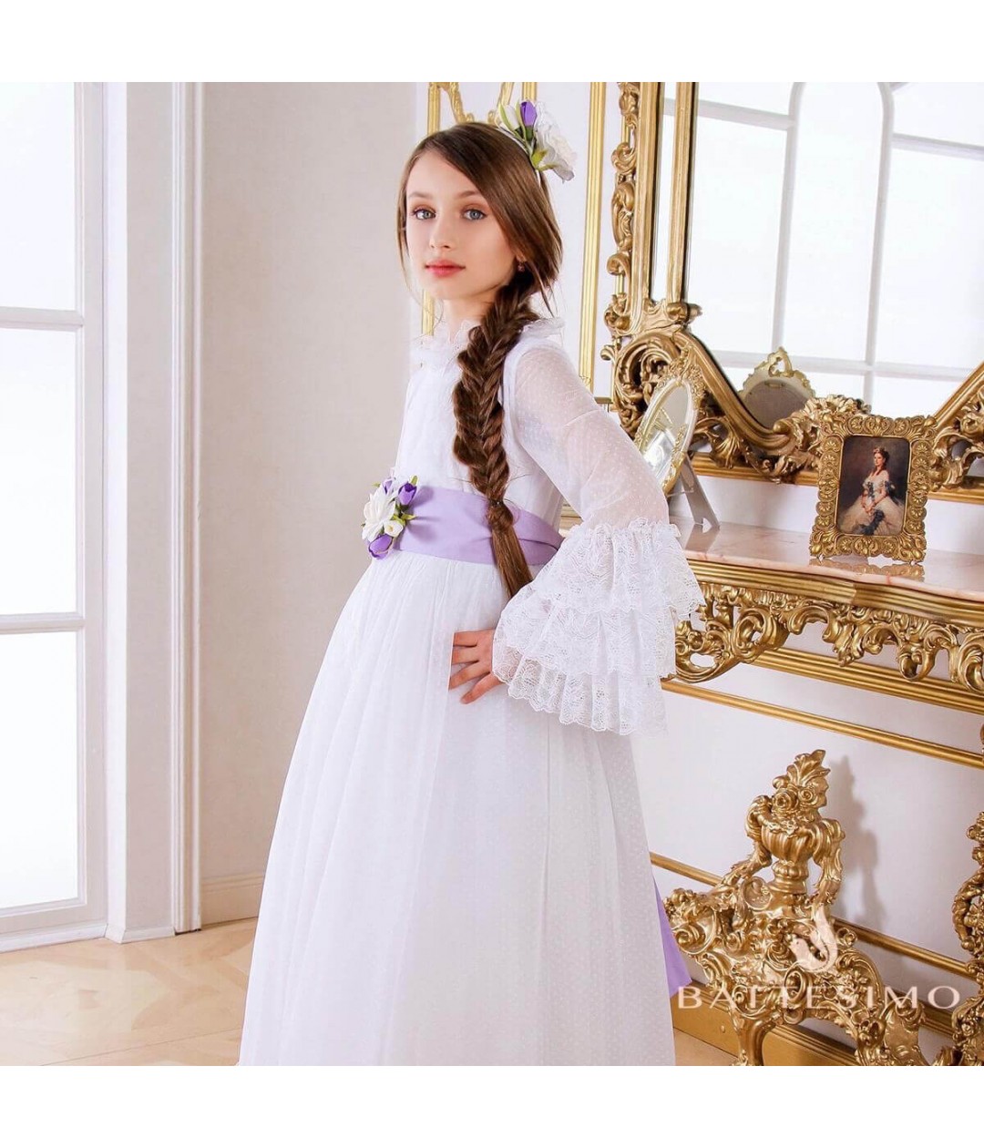 Available in classic ivory or white, this dress also features traditional long sleeves for a modest and elegant appearance. To personalize the look, you can choose a lace belt in white, ivory, light green, violet, or even request your own custom color. Simply mention your preference in the order notes.