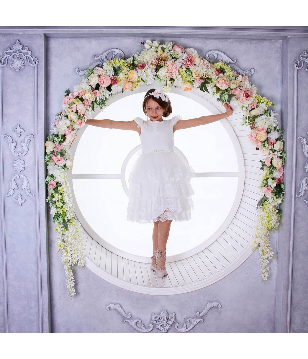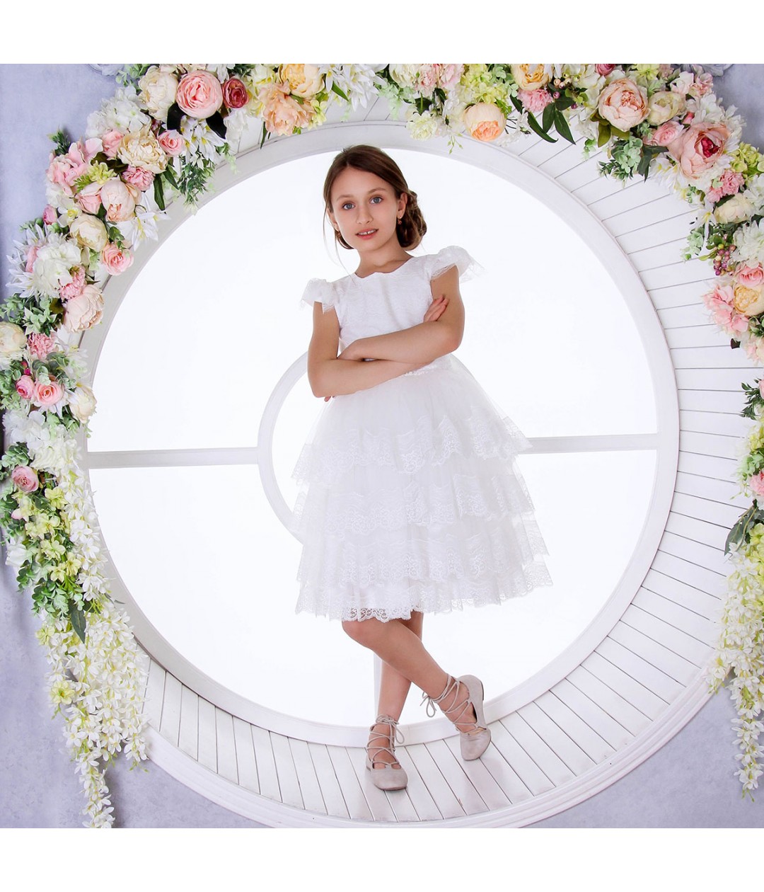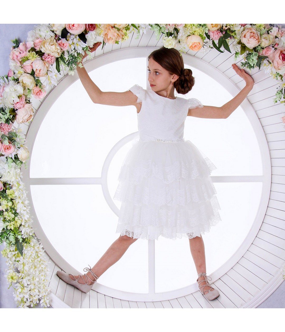 Step into timeless elegance with our Ivory Merletti Lace Dress for Girls, a refined piece designed for the most special occasions. Crafted from authentic Italian Merletti lace, this dress features a soft lace bodice and a luxurious three-layer lace skirt that creates graceful movement and texture.