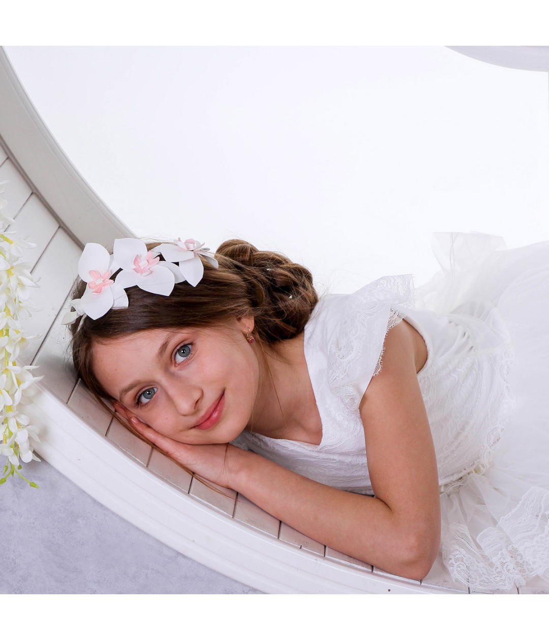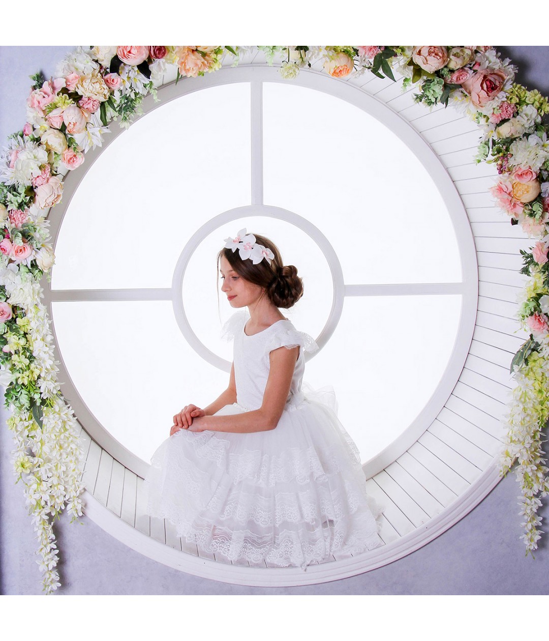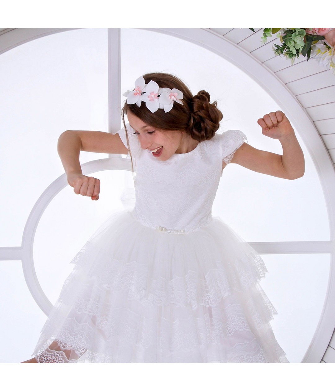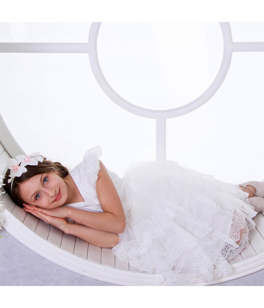 The exquisite lace pattern, originally designed in 1926, brings a touch of vintage charm to the modern silhouette. Its delicate ivory tone makes it ideal for weddings, birthdays, First Communion, or any moment you want her to shine with classic beauty.