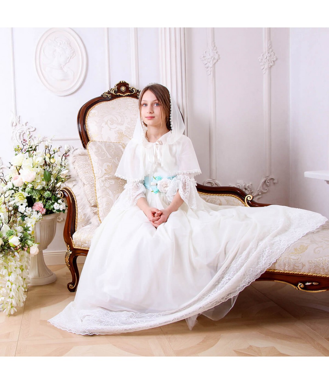 Designed in a classic caped mantilla style, the ARIEL veil ties securely under the chin with silk ribbons, offering both beauty and comfort throughout the ceremony. Its timeless simplicity pairs effortlessly with any Communion dress, adding a reverent and graceful touch to her sacred celebration.