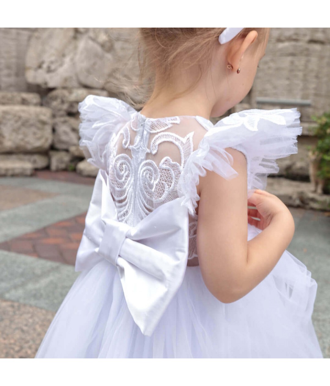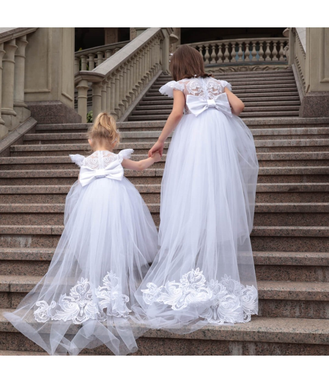 The back of the dress is adorned with a large detachable bow, while the optional train adds drama with its lace-trimmed edge—perfect for a grand entrance and easily removable for reception or play.