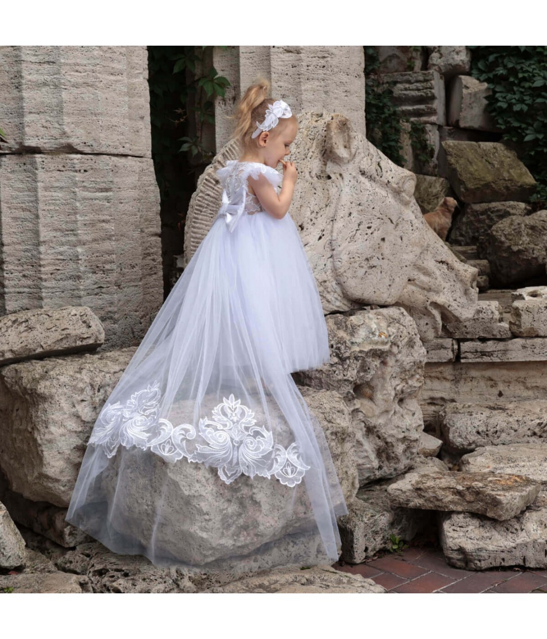 It comes complete with a matching lace headband to finish the look.This dress can be custom made in white or ivory, ensuring the perfect match for your wedding theme or special occasion.