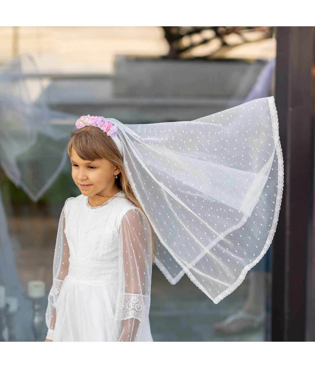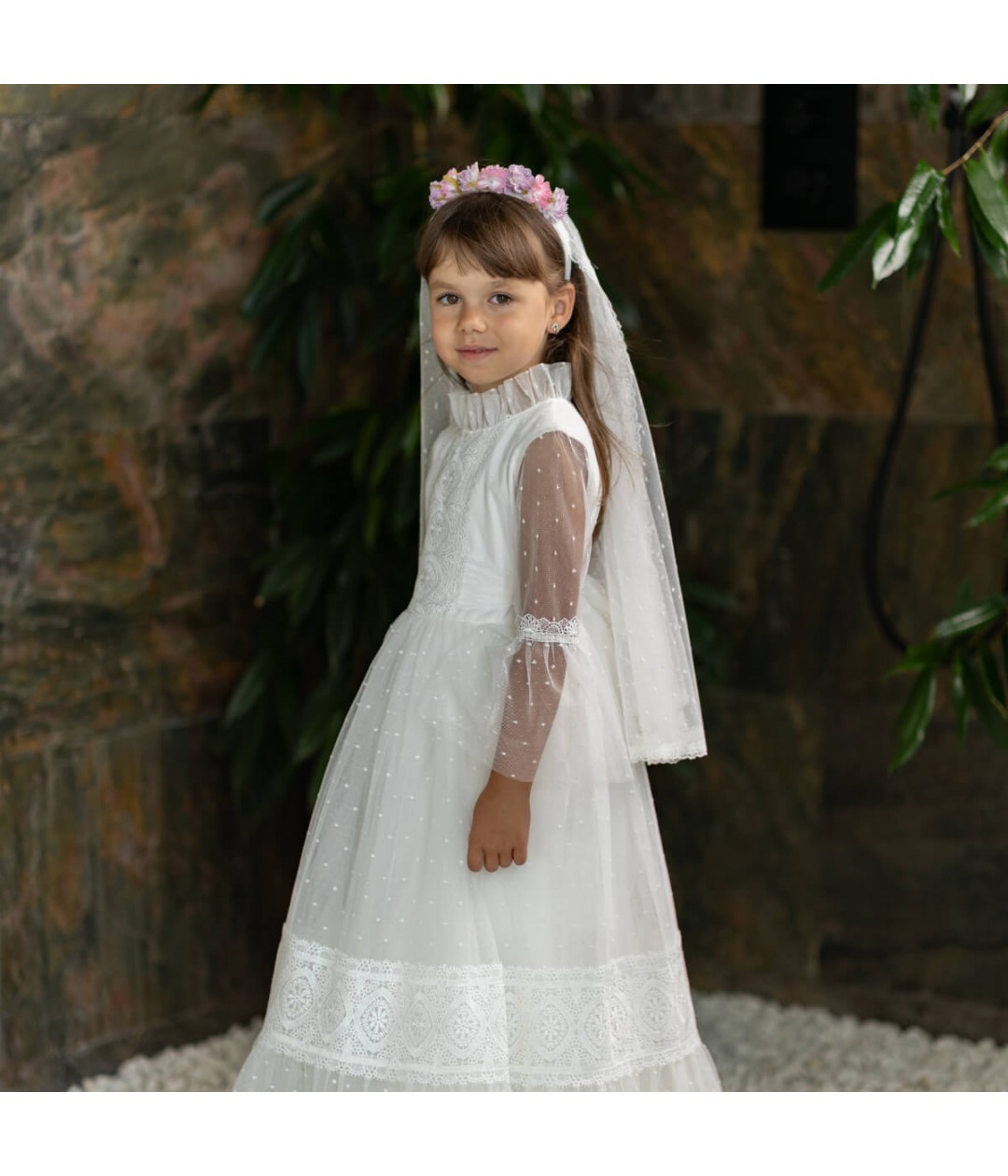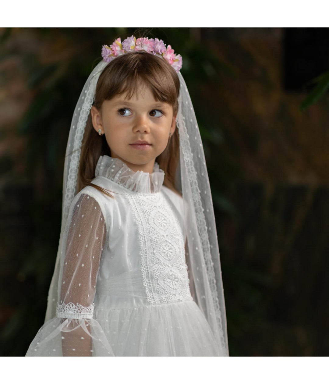 The attached veil drapes gracefully, featuring luxurious Italian lace trim that adds a touch of traditional beauty. Designed to pair perfectly with any ivory Communion dress, this headpiece is lightweight, secure, and handcrafted for a memorable day.
