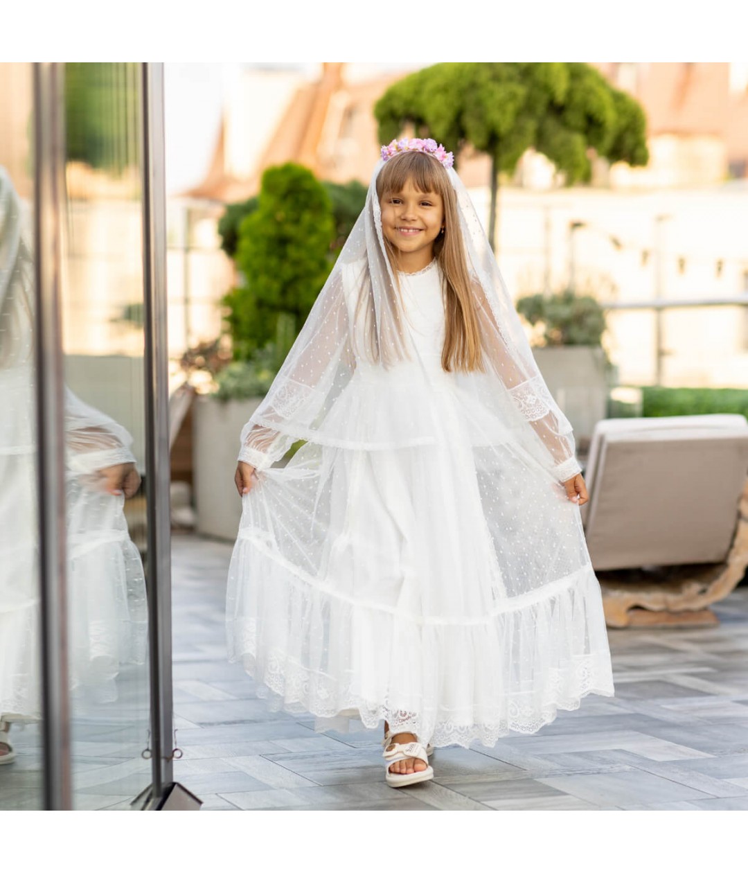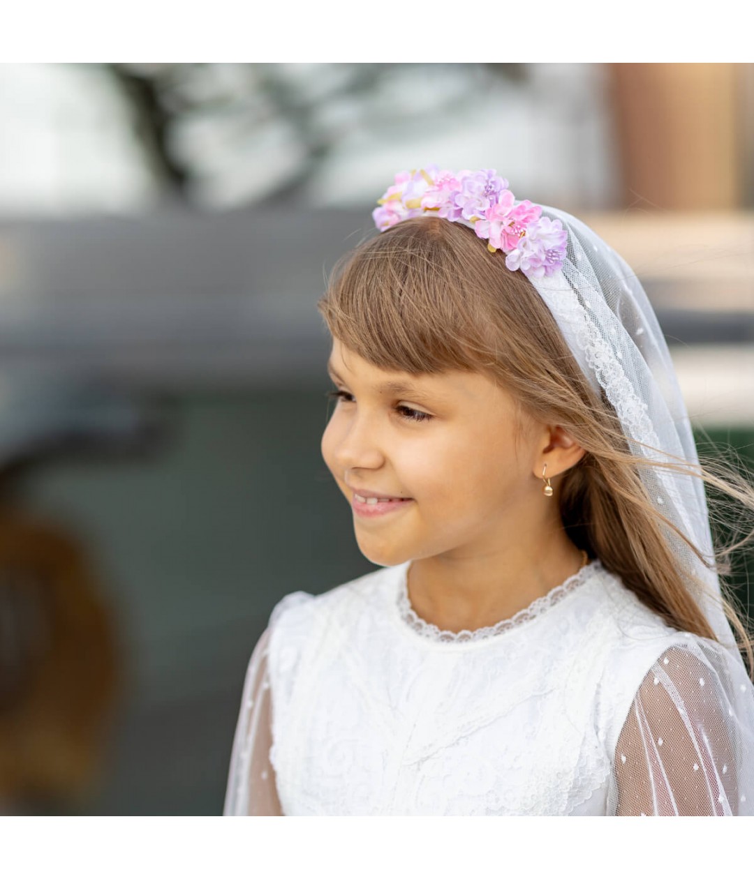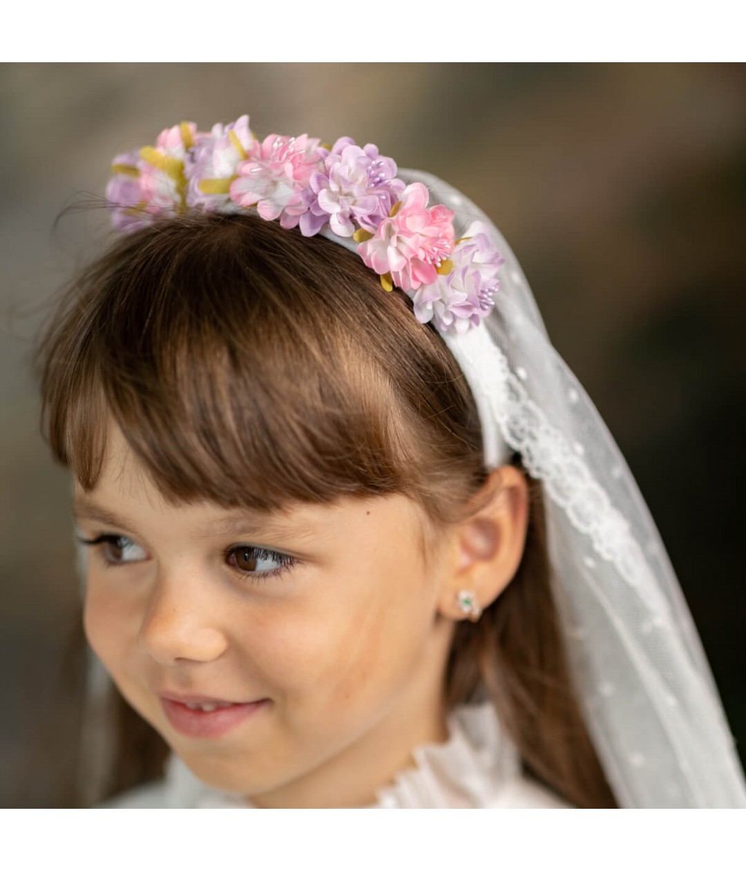 The attached veil drapes gracefully, featuring luxurious Italian lace trim that adds a touch of traditional beauty. Designed to pair perfectly with any ivory Communion dress, this headpiece is lightweight, secure, and handcrafted for a memorable day.
