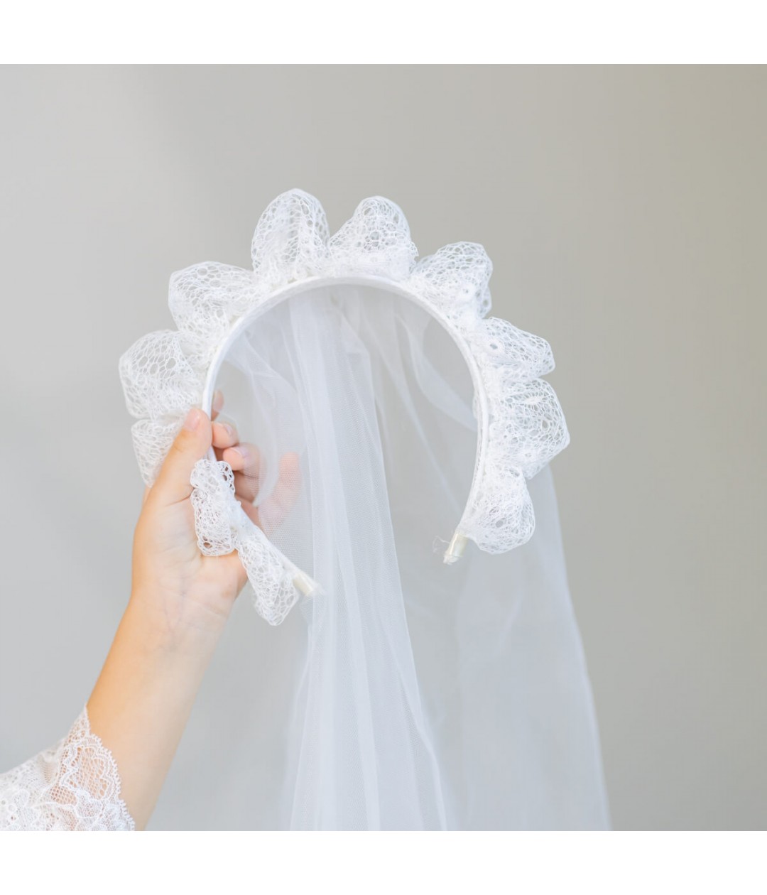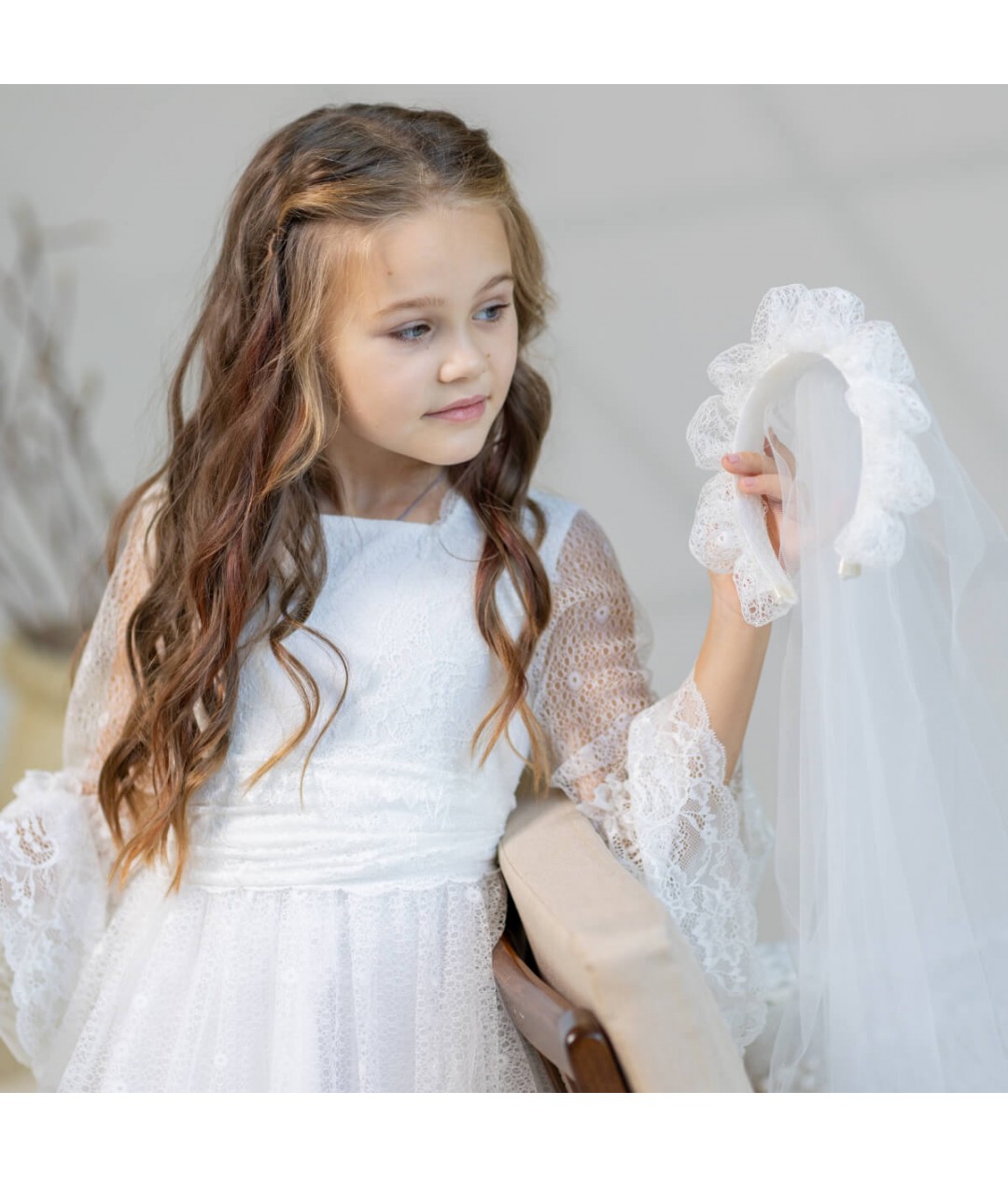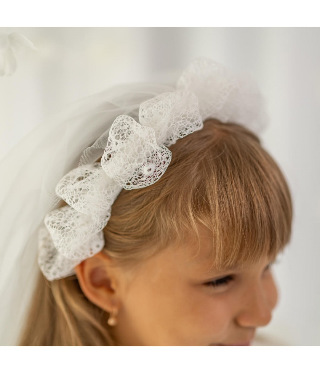 Elevate her special day look with the ELIZA Ivory Communion Veil Headband, a refined and delicate accessory crafted to complement dresses like KAYA and Eliza. This headband features charming lace bubbles and a soft tulle veil, creating a sweet and sophisticated style that perfectly pairs with any elegant Communion dress.