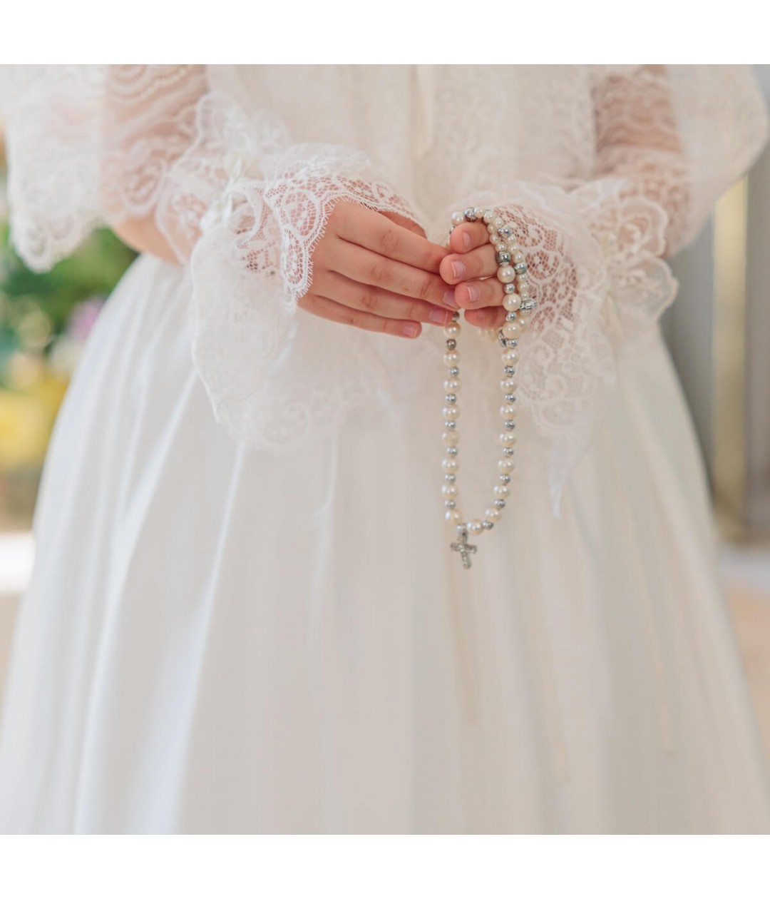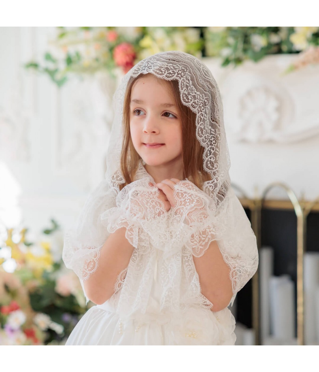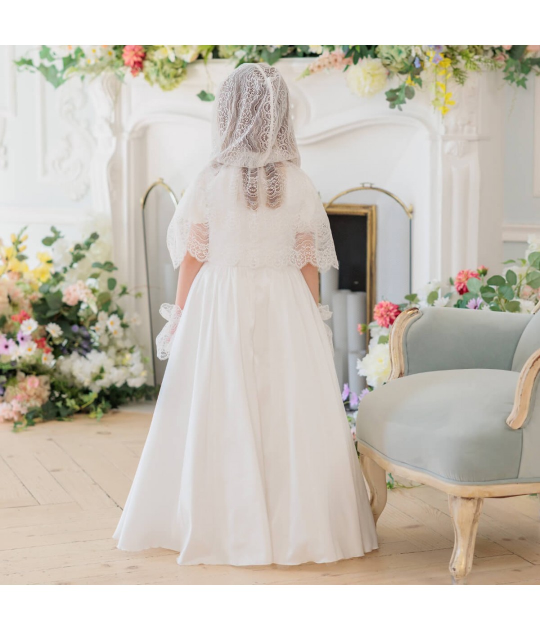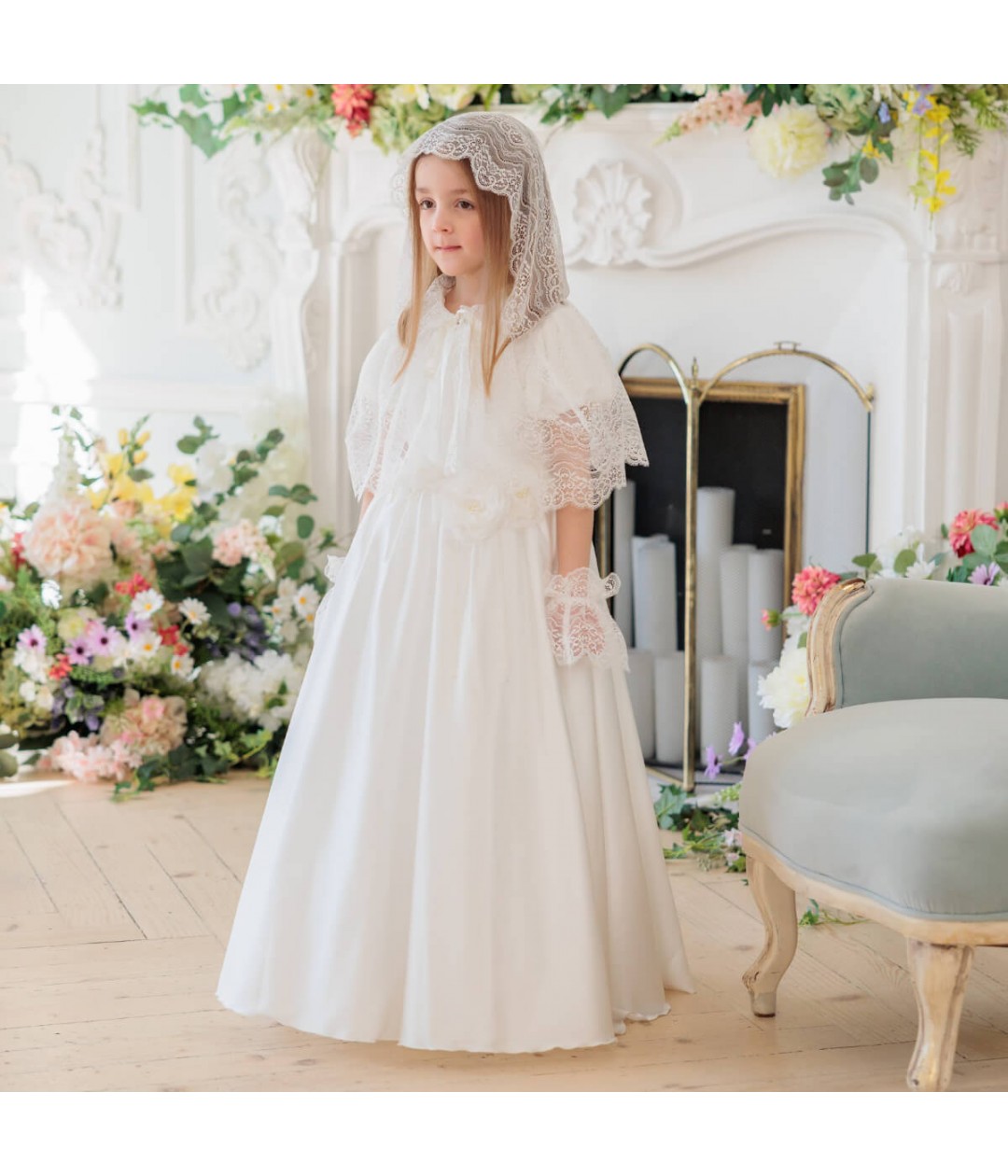 Fully lined with breathable batiste for maximum comfort, the ELIZABETH dress ensures your little one feels as beautiful as she looks. It includes dress only, while matching gloves and mantilla veil can be purchased separately to complete the traditional Communion look.
