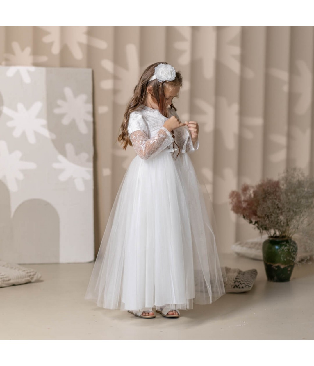 Crafted with care, this delicate hair accessory features a silk-covered band adorned with a handmade silk flower, offering a refined, minimalist finish perfect for First Communion, flower girls, or other special occasions.