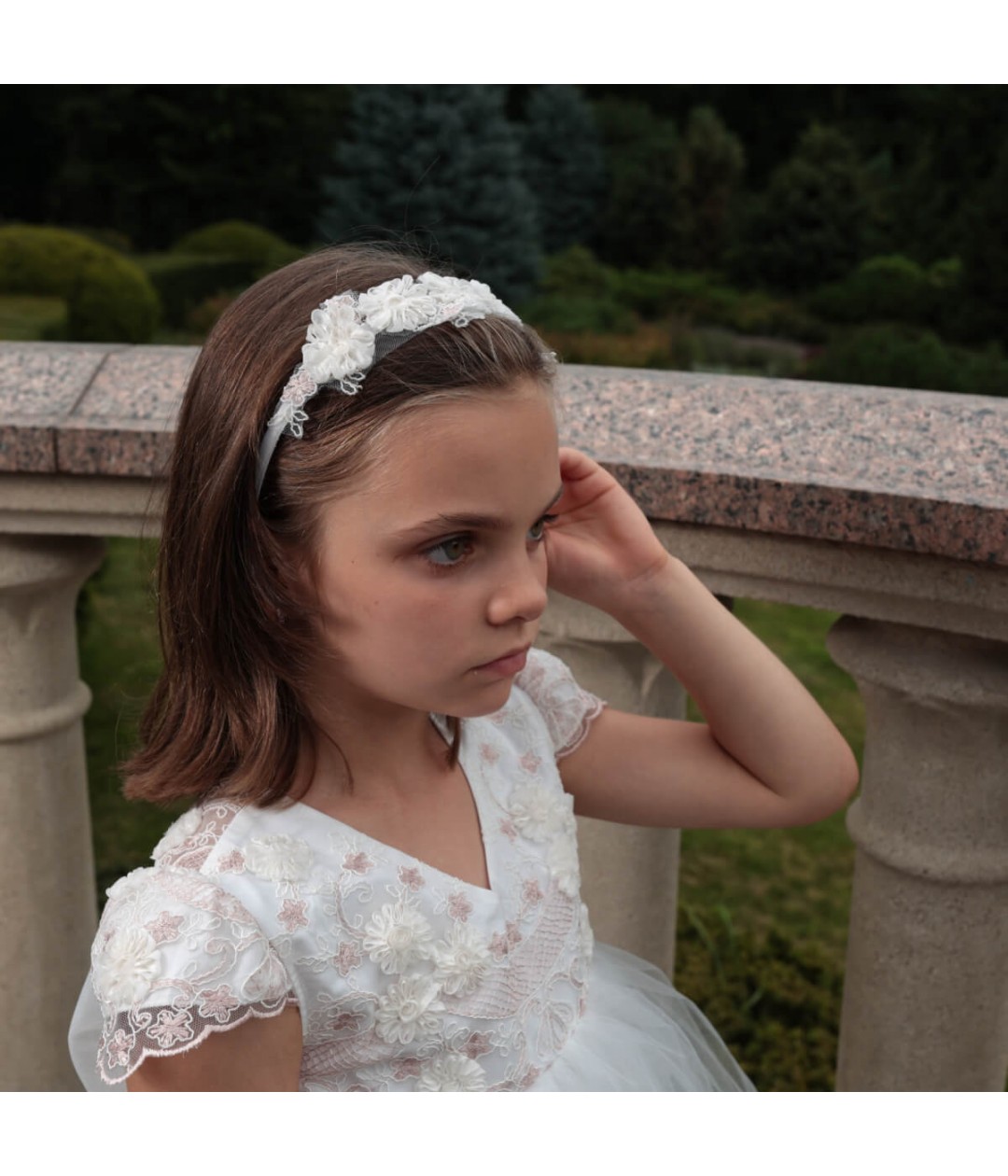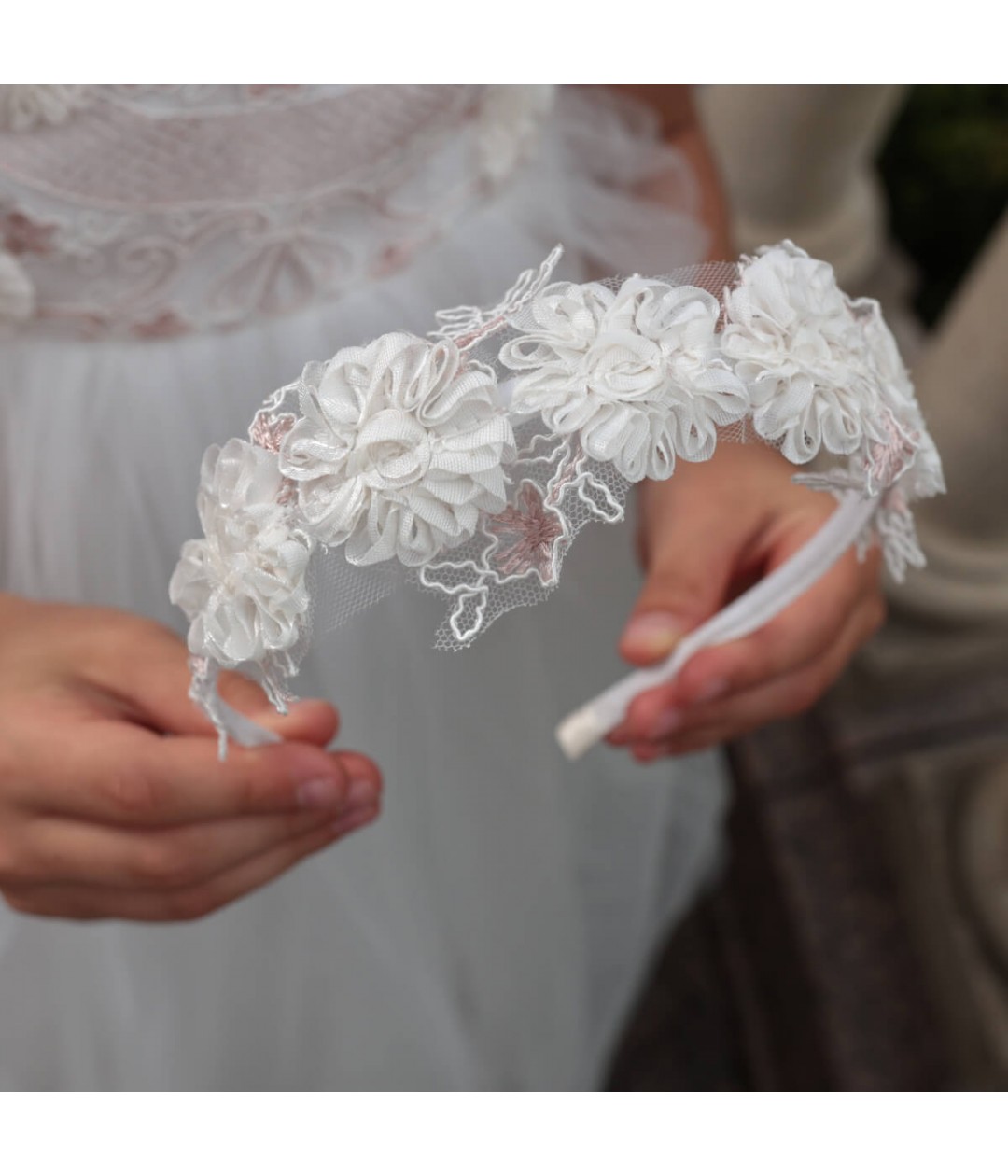 Lightweight and flexible, this floral headband sits gently on the head and can be worn comfortably throughout the day. Want to use it for a First Communion? Simply add a veil, and you’ll have a complete ceremonial accessory.