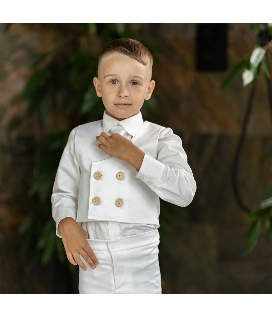 This 4-piece ensemble includes tailored pants, a crisp cotton shirt, a matching vest, and a stylish bow tie—everything he needs for a polished First Communion look.