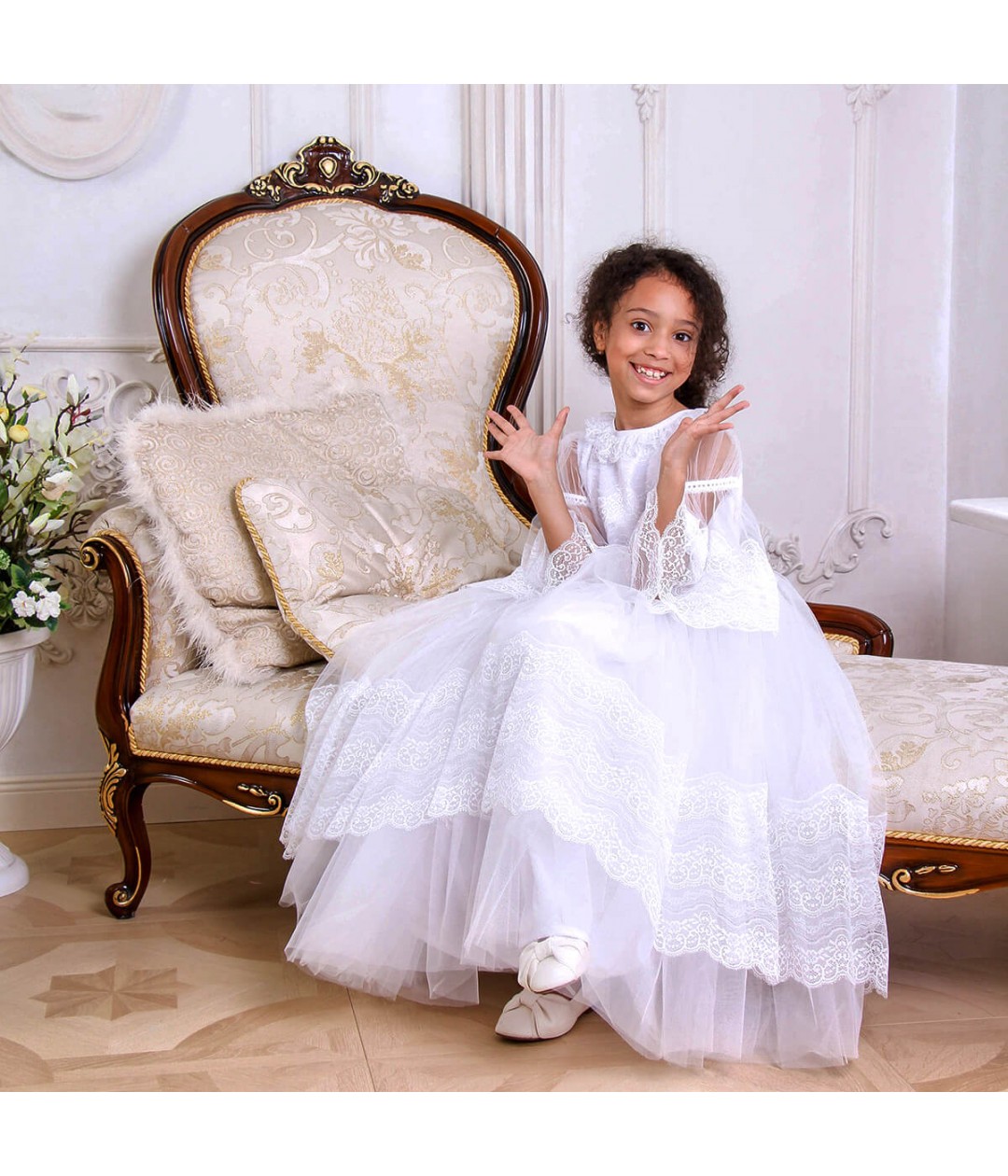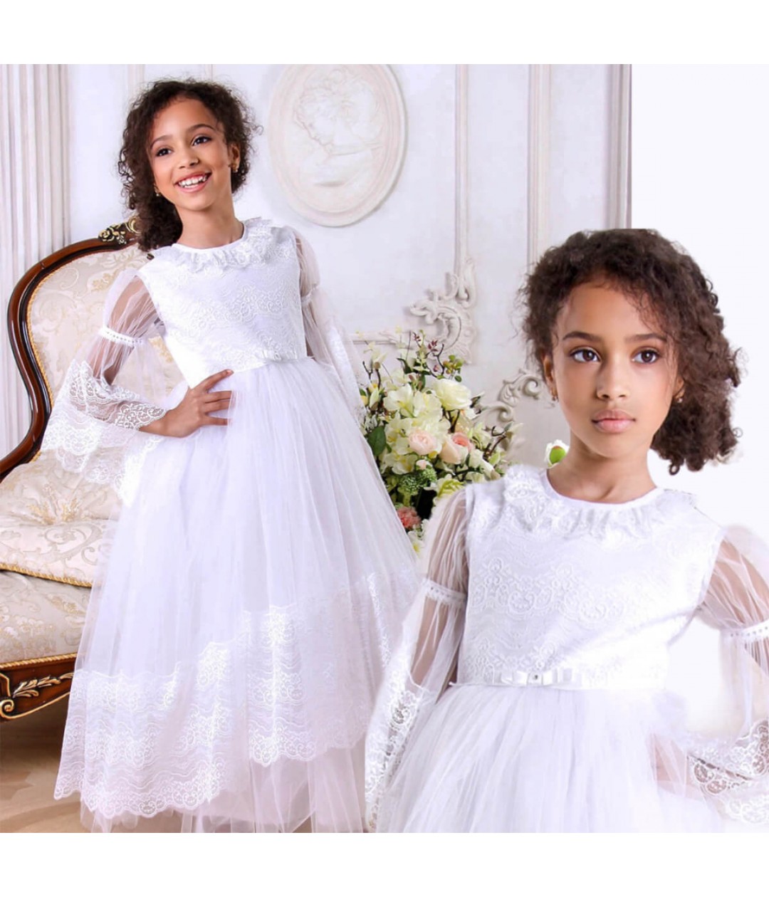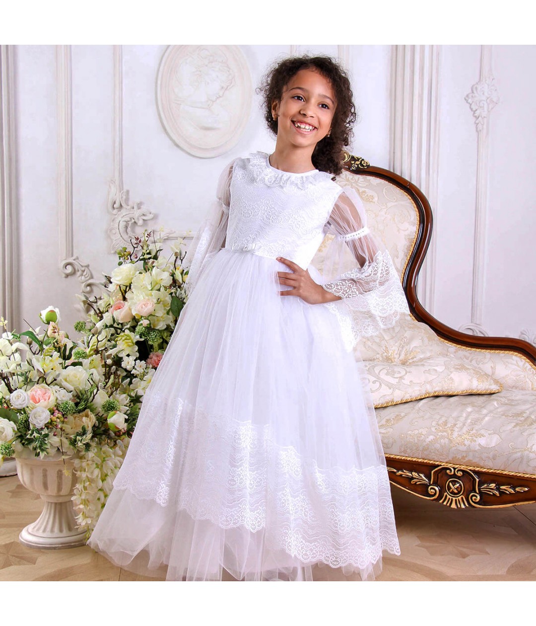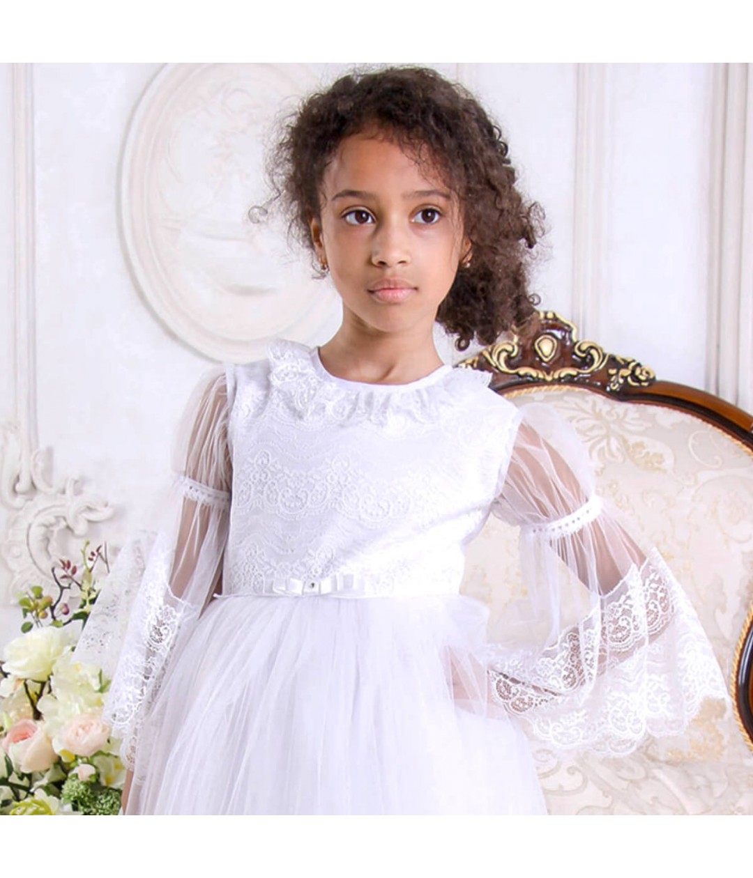 crafted in a soft ivory shade and adorned with exquisite Italian Merletti lace. This dress is a beautiful blend of tradition and sophistication, designed to make her First Holy Communion truly unforgettable.