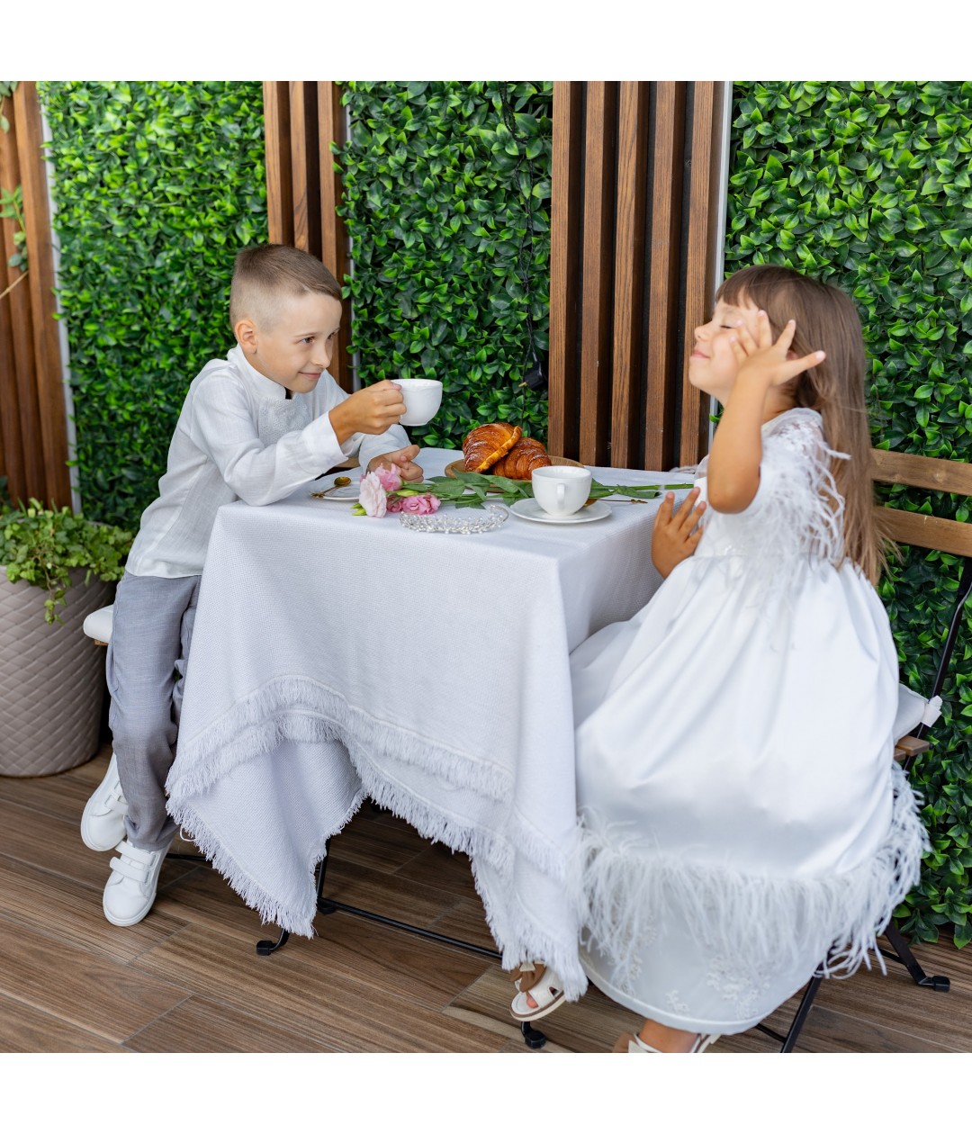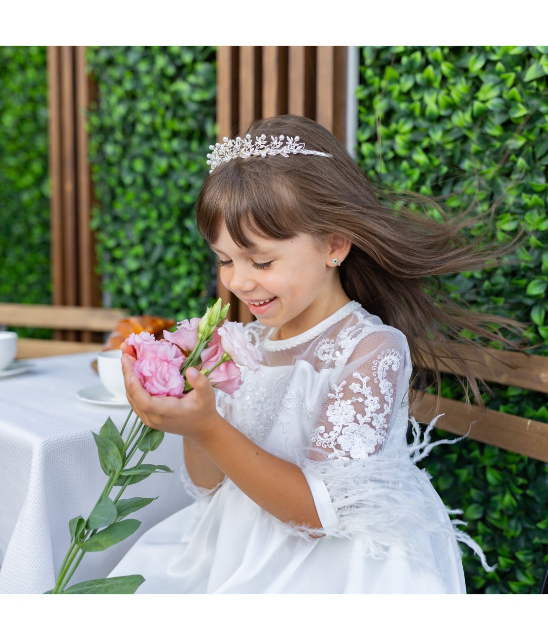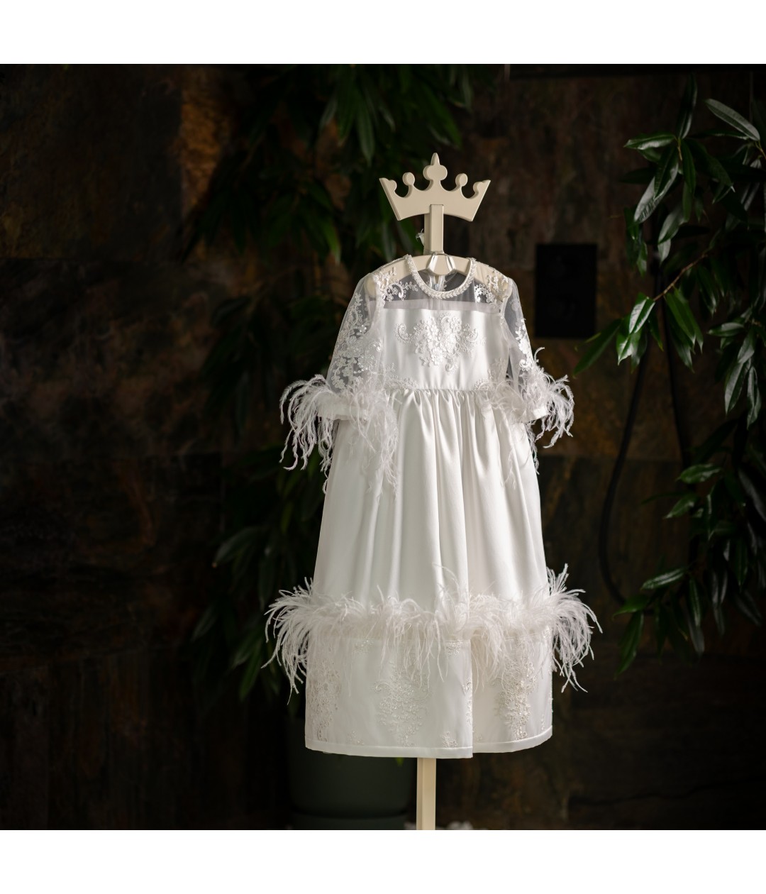 Every detail is thoughtfully designed—from the delicate lace sleeves adorned with soft feathers, to the hand-sewn beaded strip that decorates the bodice with sparkle and elegance.