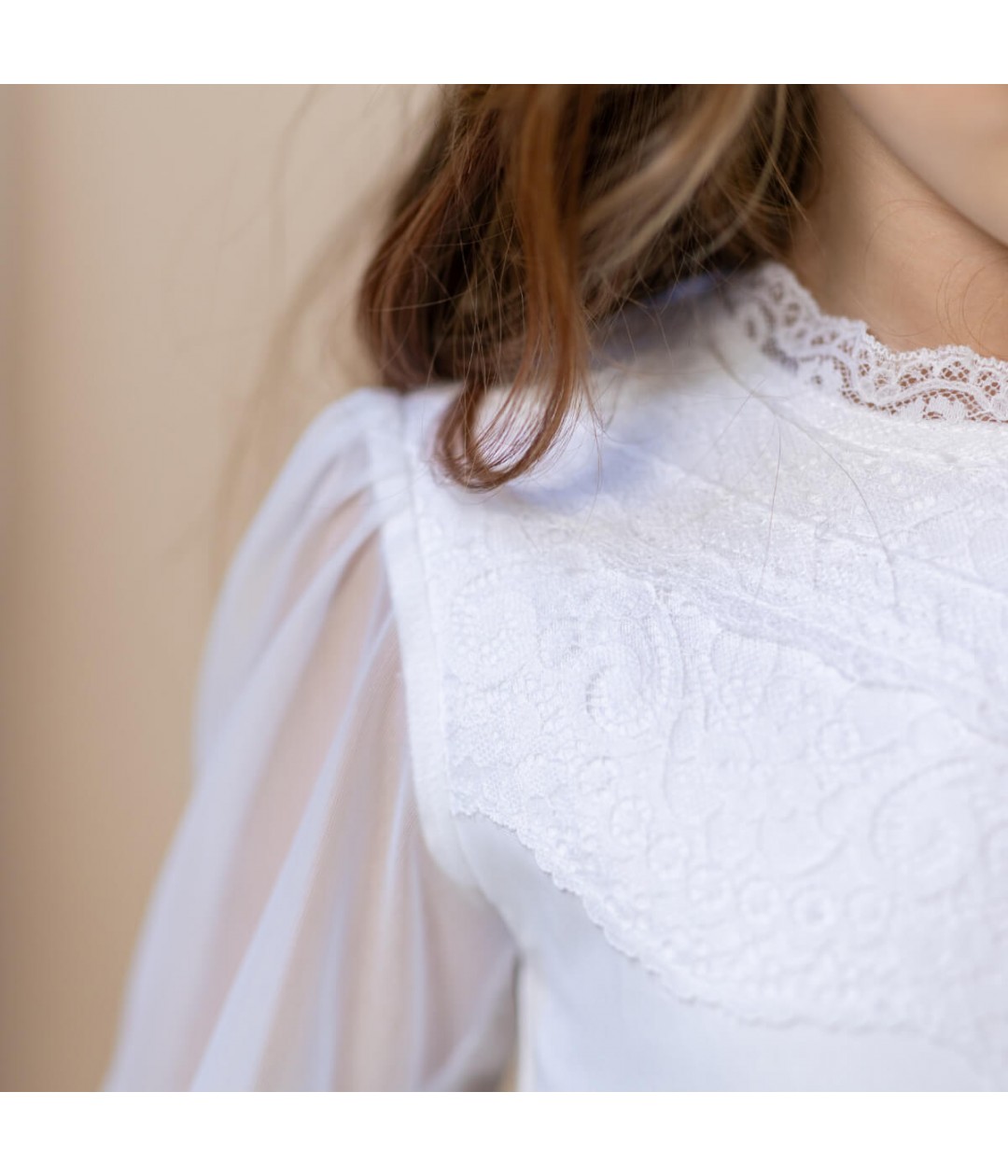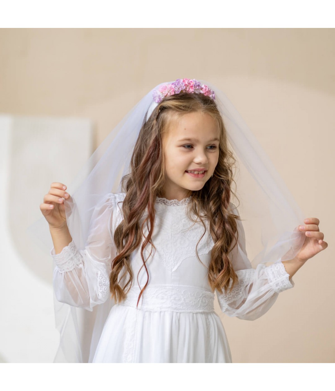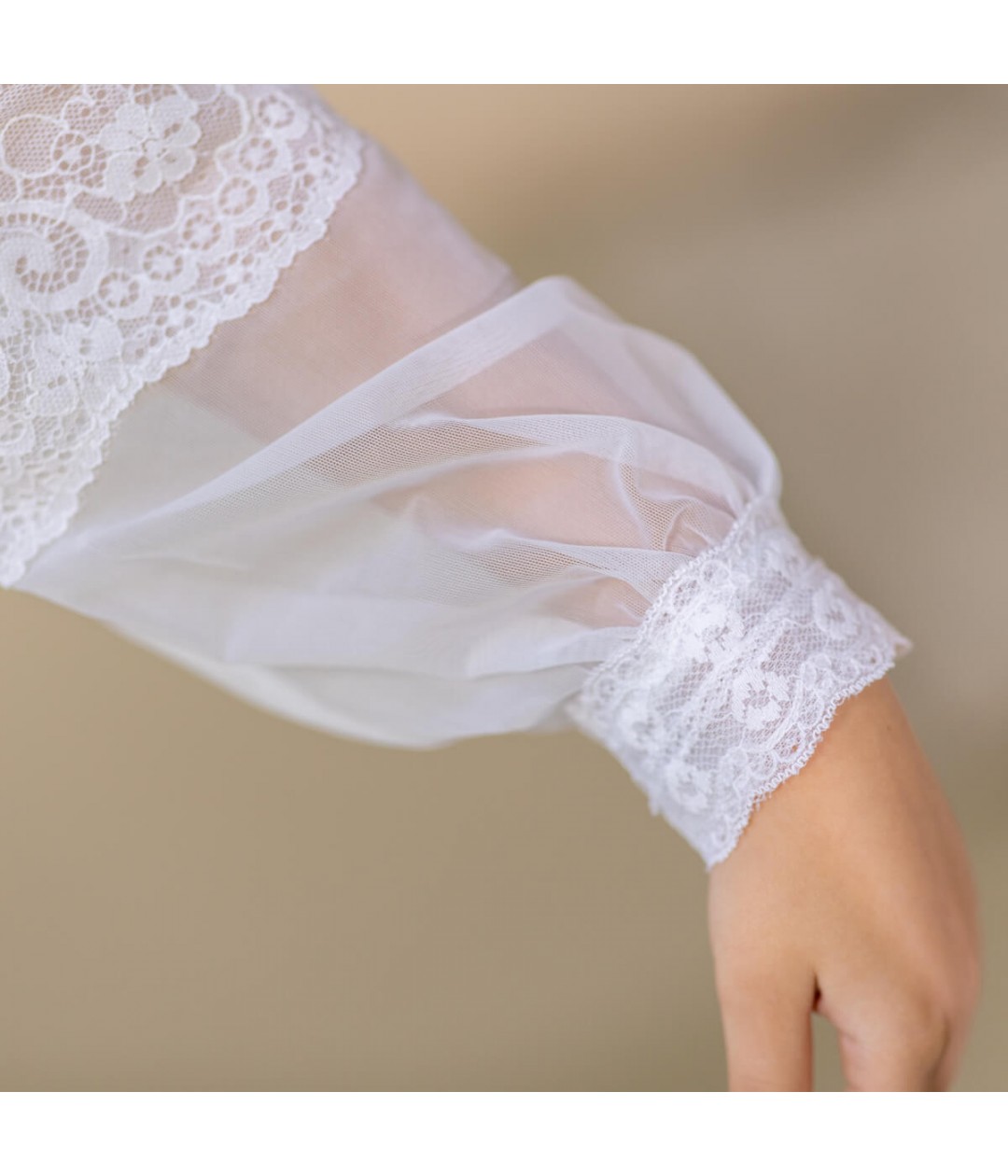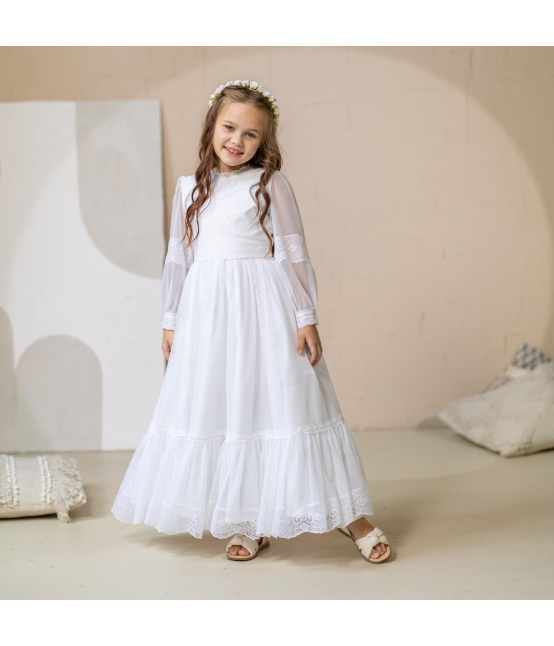 is a stunning white lace gown, perfect for a traditional First Communion ceremony.