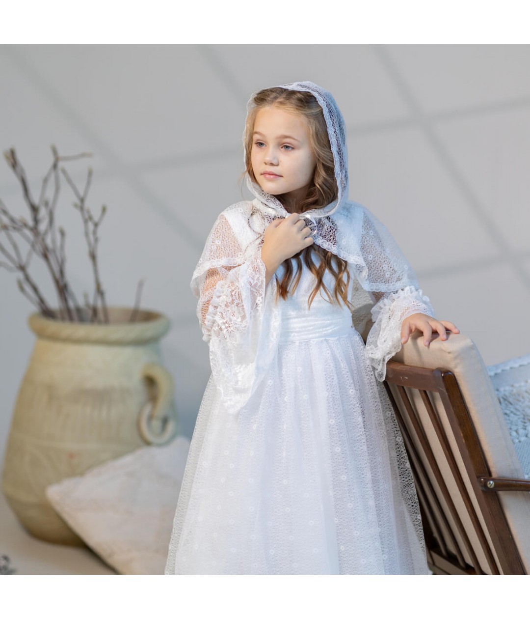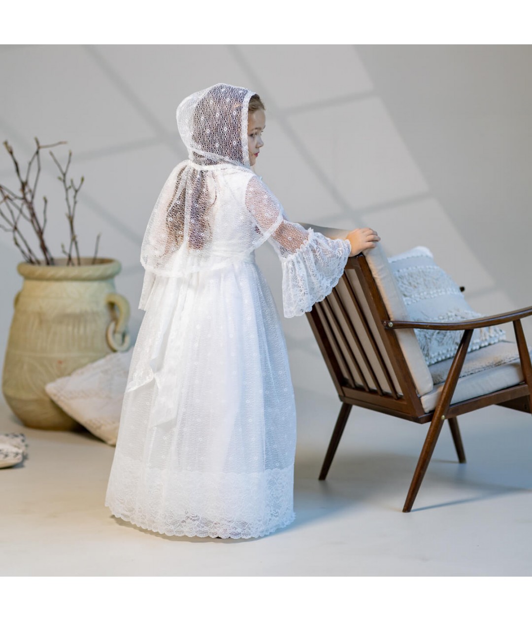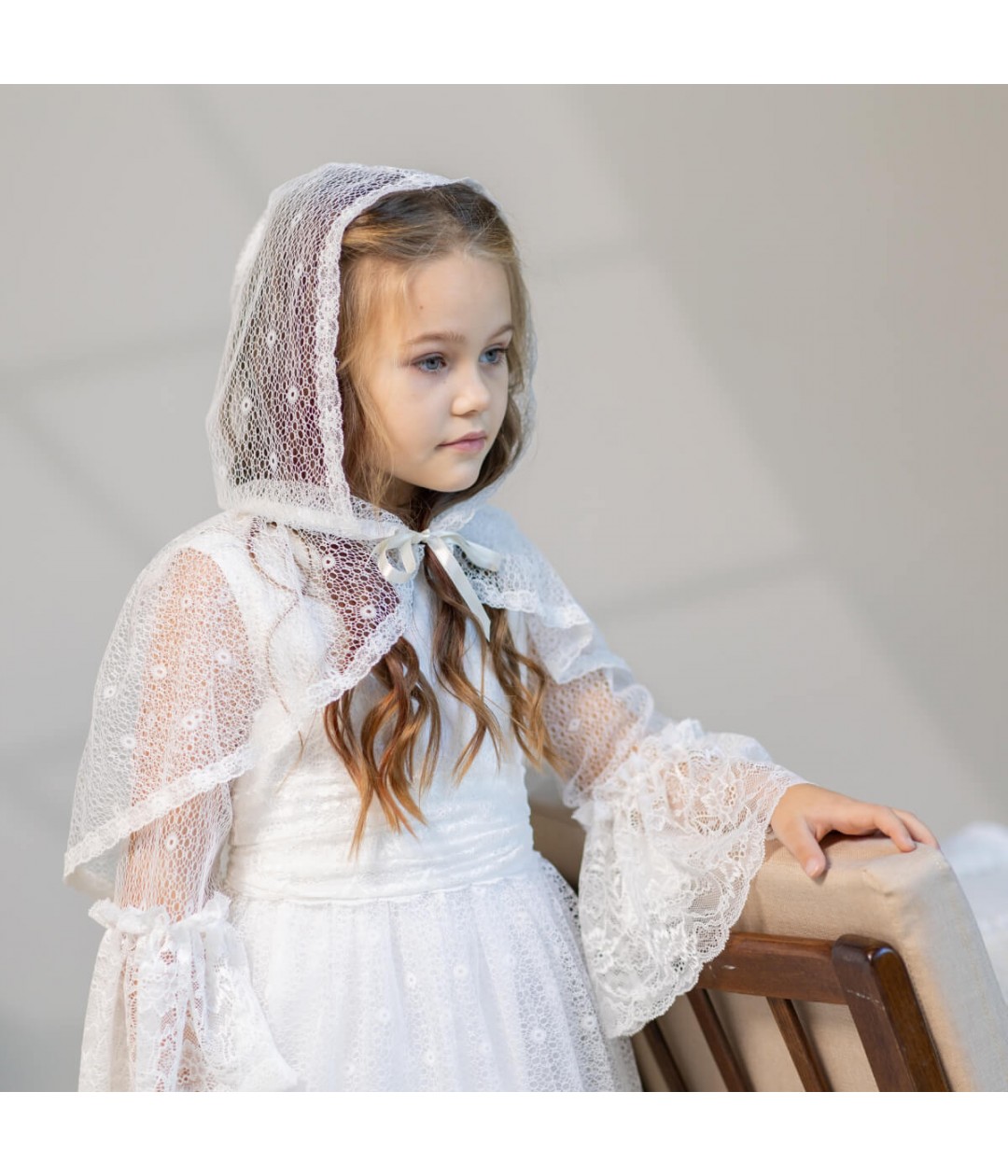The caped style ensures a graceful fit over her shoulders, while the silk ties provide a secure and comfortable closure. Designed in soft ivory, this veil perfectly complements any Communion dress and adds a sense of old-world charm to the ceremony.