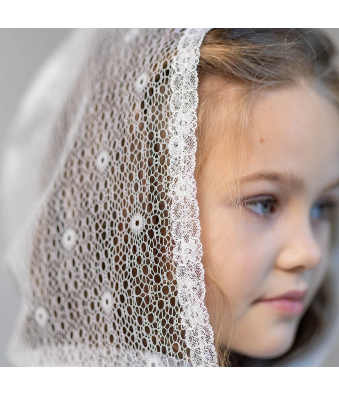 Bring a touch of timeless elegance to her First Communion day with our Communion Veil Caped Mantilla. Inspired by the traditional church mantilla, this veil is crafted from luxurious designer tulle and finished with exquisite Italian lace trim for a look that is both classic and refined.