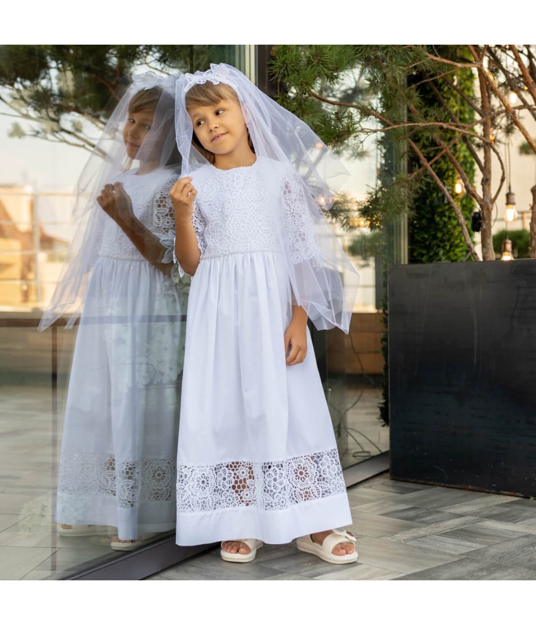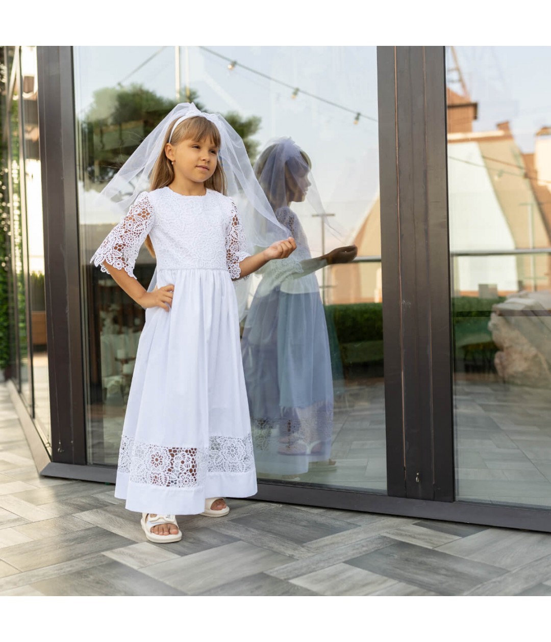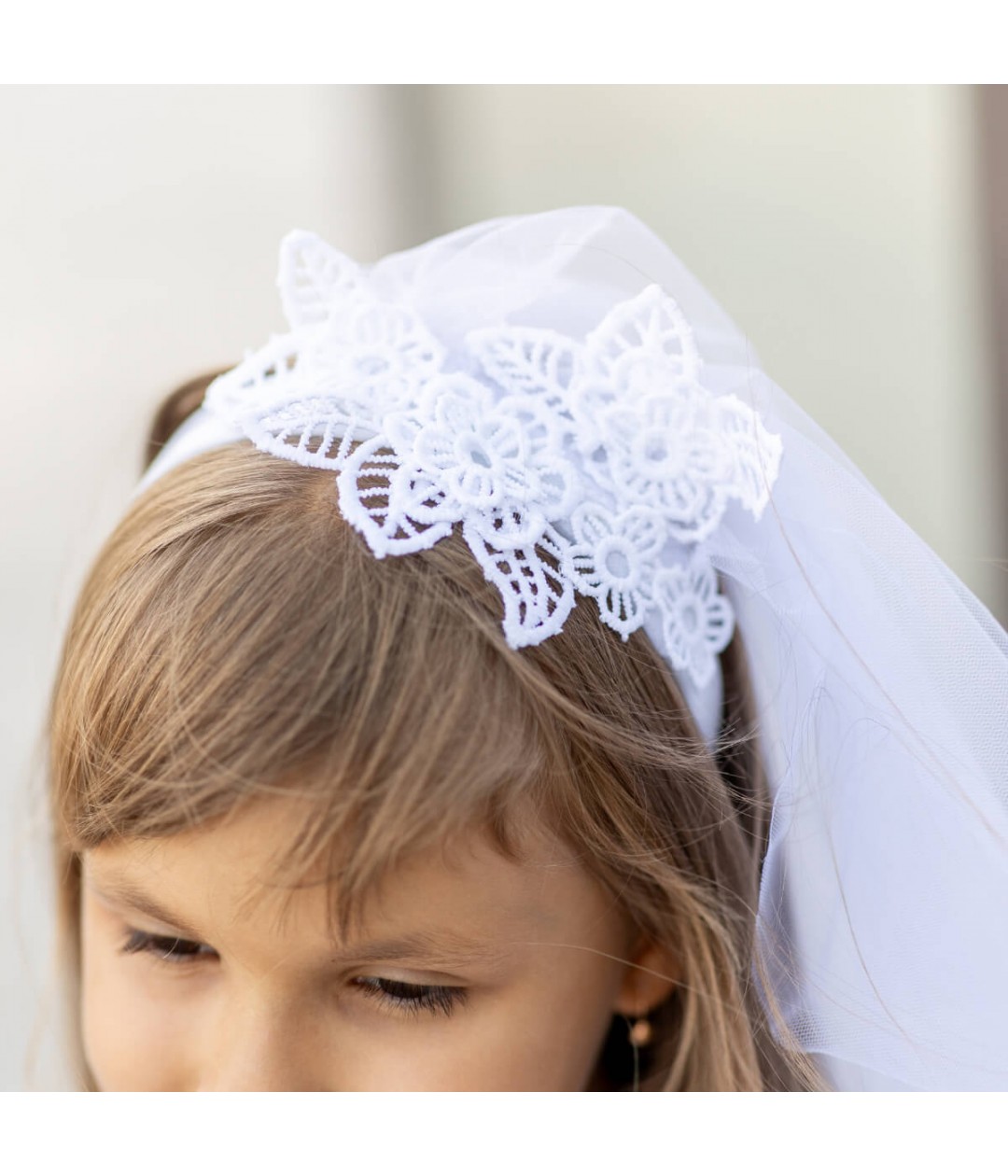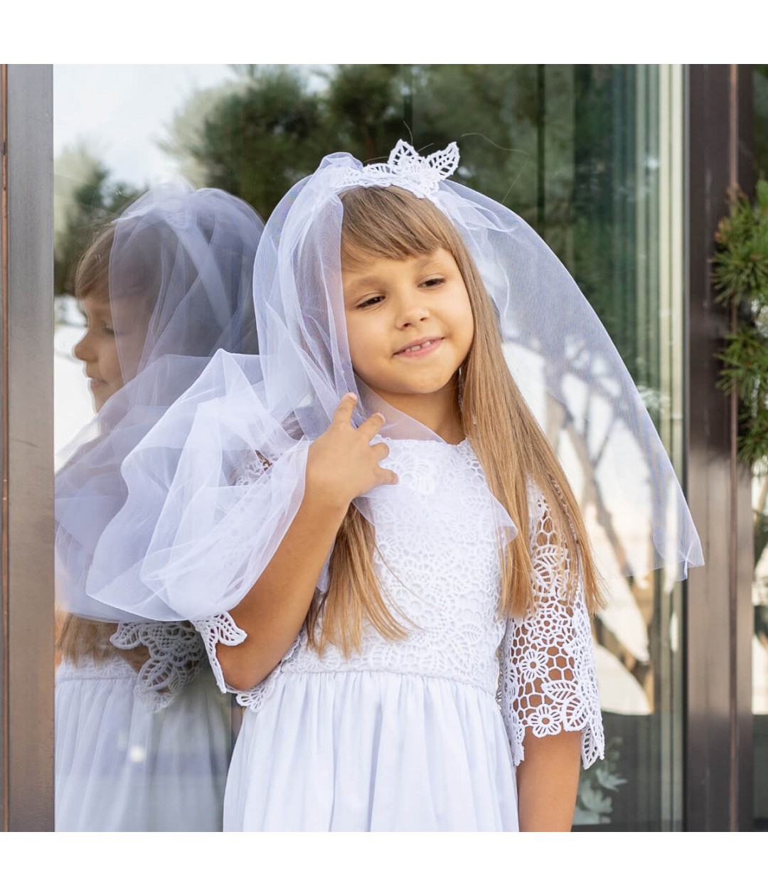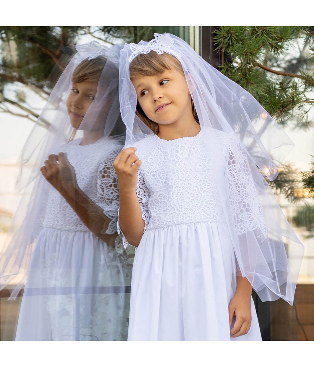 Designed for comfort and simplicity, this veil headband is lightweight and stays securely in place throughout the ceremony. The crisp white color makes it an ideal pairing with a wide range of dresses, especially the Larisa Communion Dress, with which it creates a beautifully coordinated ensemble.
