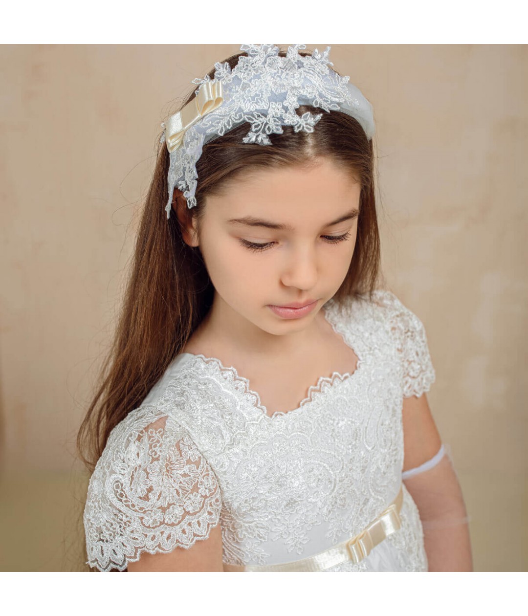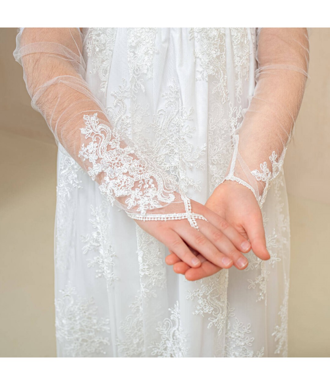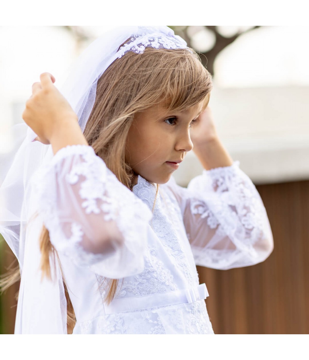 This elegant First Communion dress features a beautifully detailed French lace bodice, offering a refined and timeless look for her special day. The skirt is crafted with a soft layer of tulle over a breathable cotton lining, creating gentle volume and comfort.