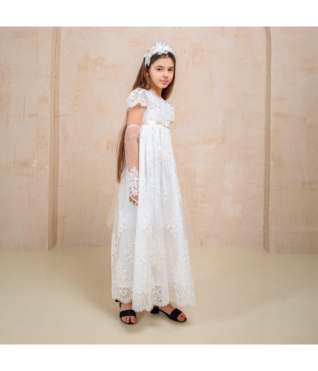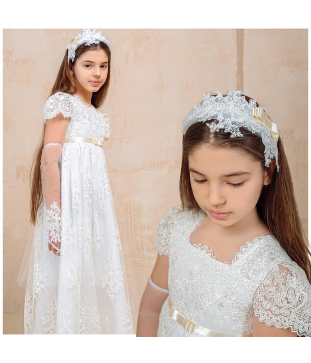 Perfectly paired with a Communion veil and gloves, this dress is designed to honor the sacred occasion with beauty, grace, and lasting charm.