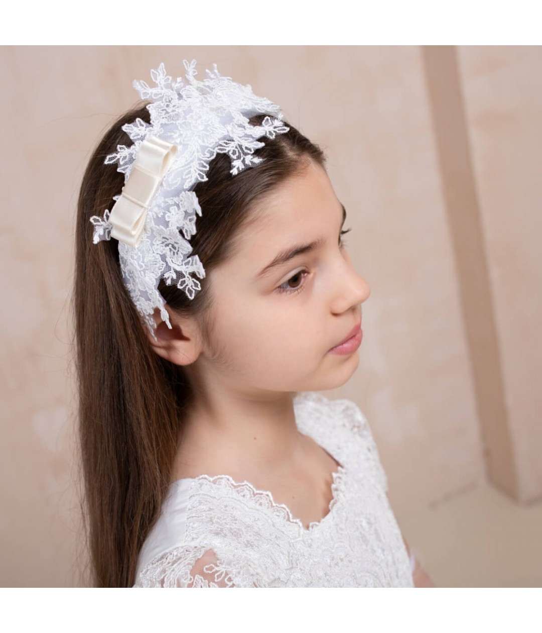 Complete your little girl’s First Communion or special occasion look with the LAYLA Lace Headband – a delicate and versatile accessory designed to pair beautifully with any ivory or white dress. This elegant headband is wrapped in soft textile for comfortable all-day wear and is adorned with refined lace detailing and a charming silk bow on top for a graceful, timeless touch.