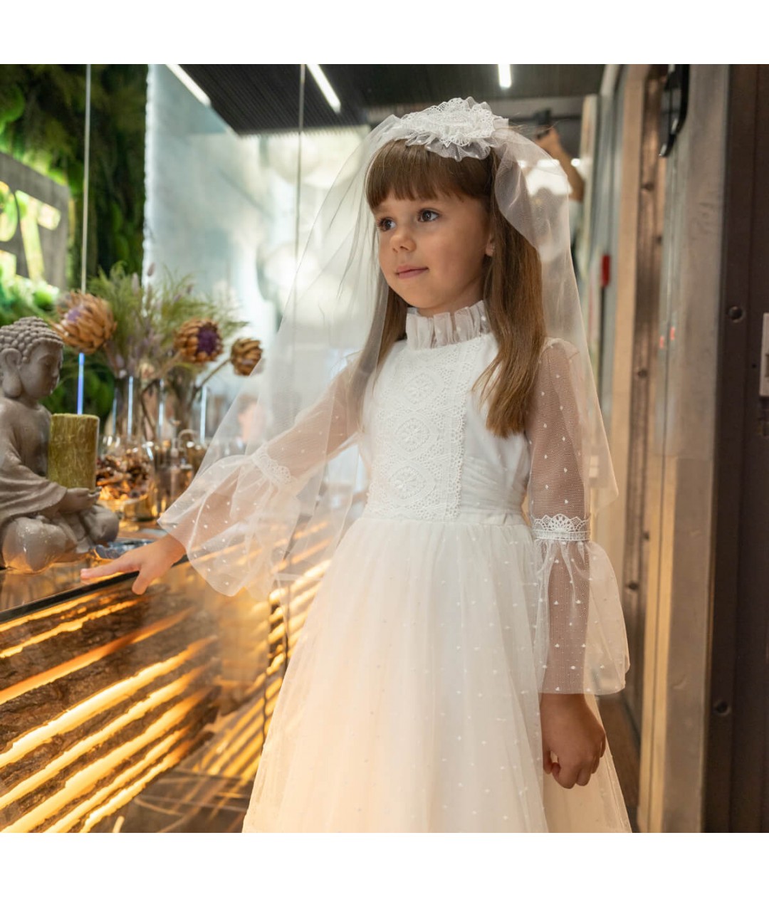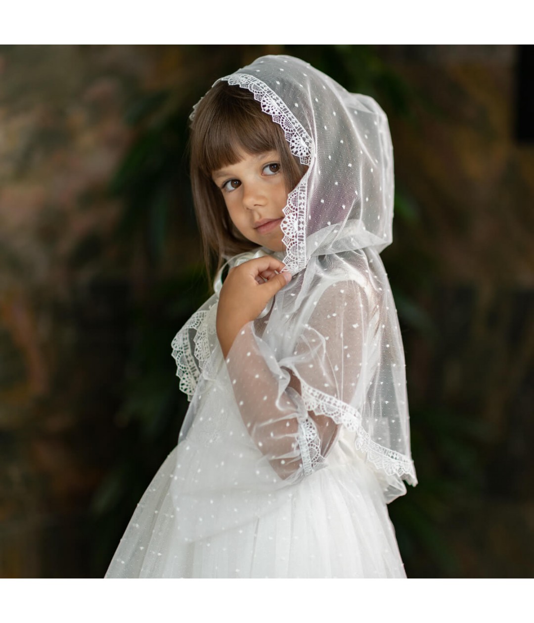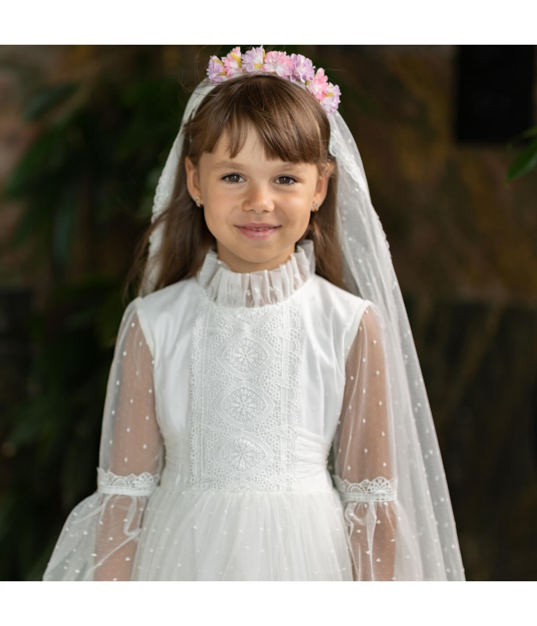 Complete the look with our optional accessories, such as a hairband with a veil or a kids church mantilla, to add an extra touch of elegance.