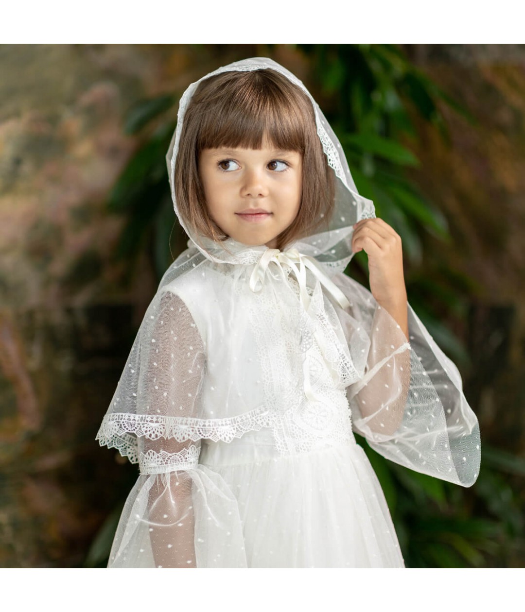 Elevate her First Communion look with the LINDA Girls' Caped Communion Veil, a charming and sophisticated accessory. Crafted from soft ivory tulle adorned with delicate little dots, this caped veil adds a unique and refined touch to her special day.