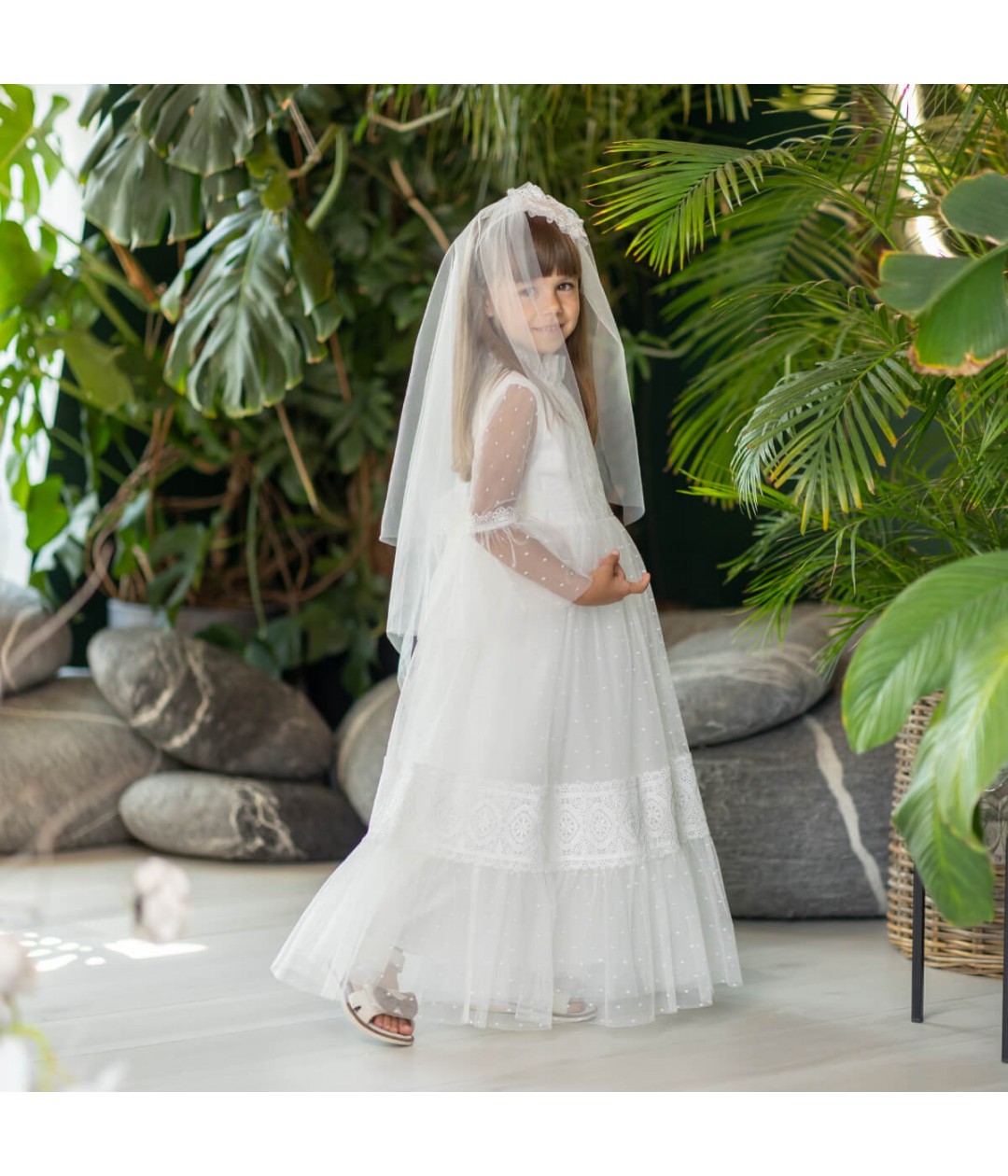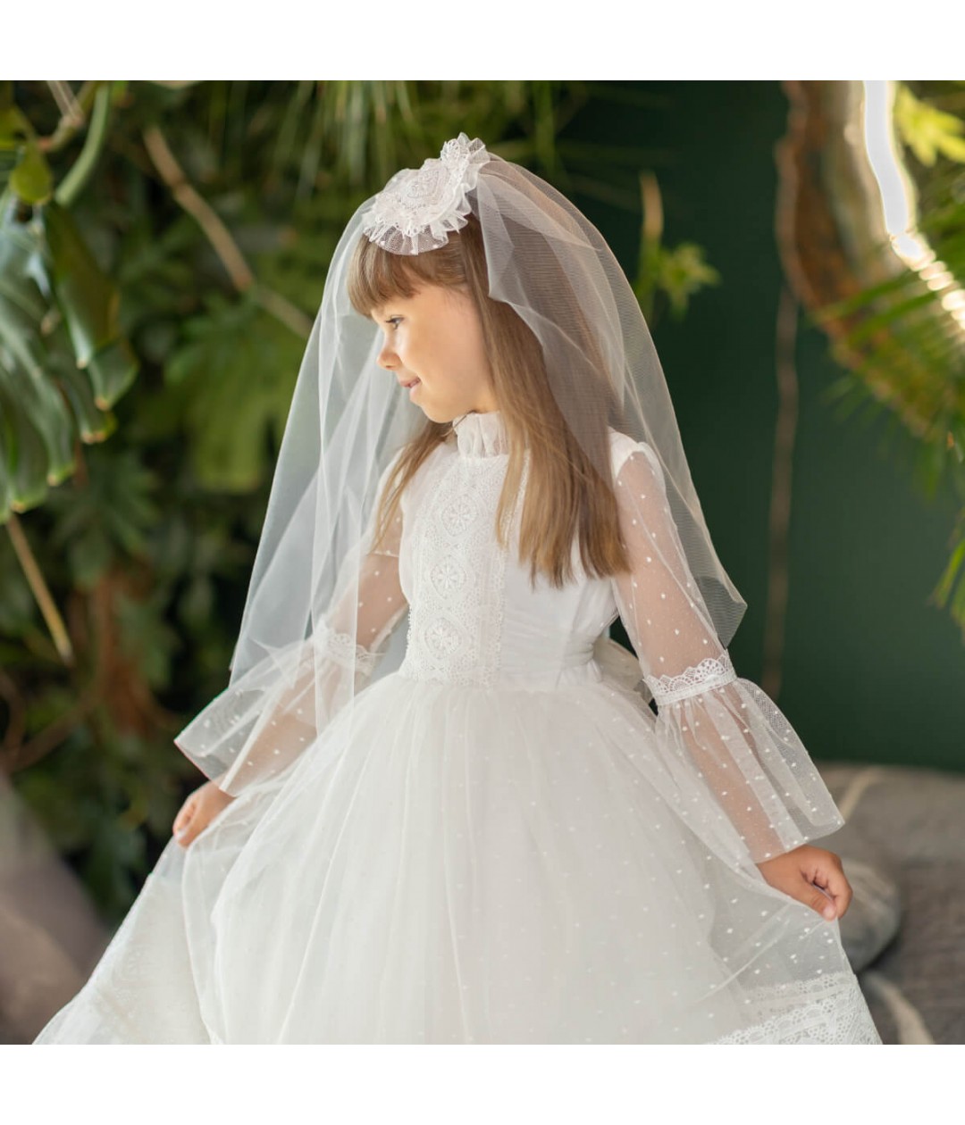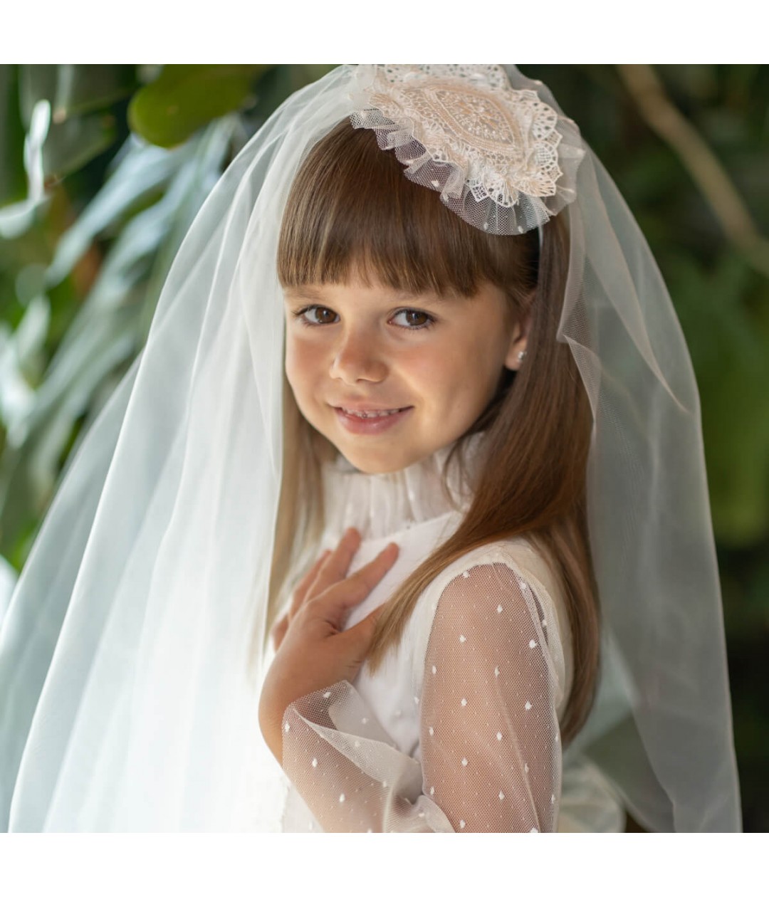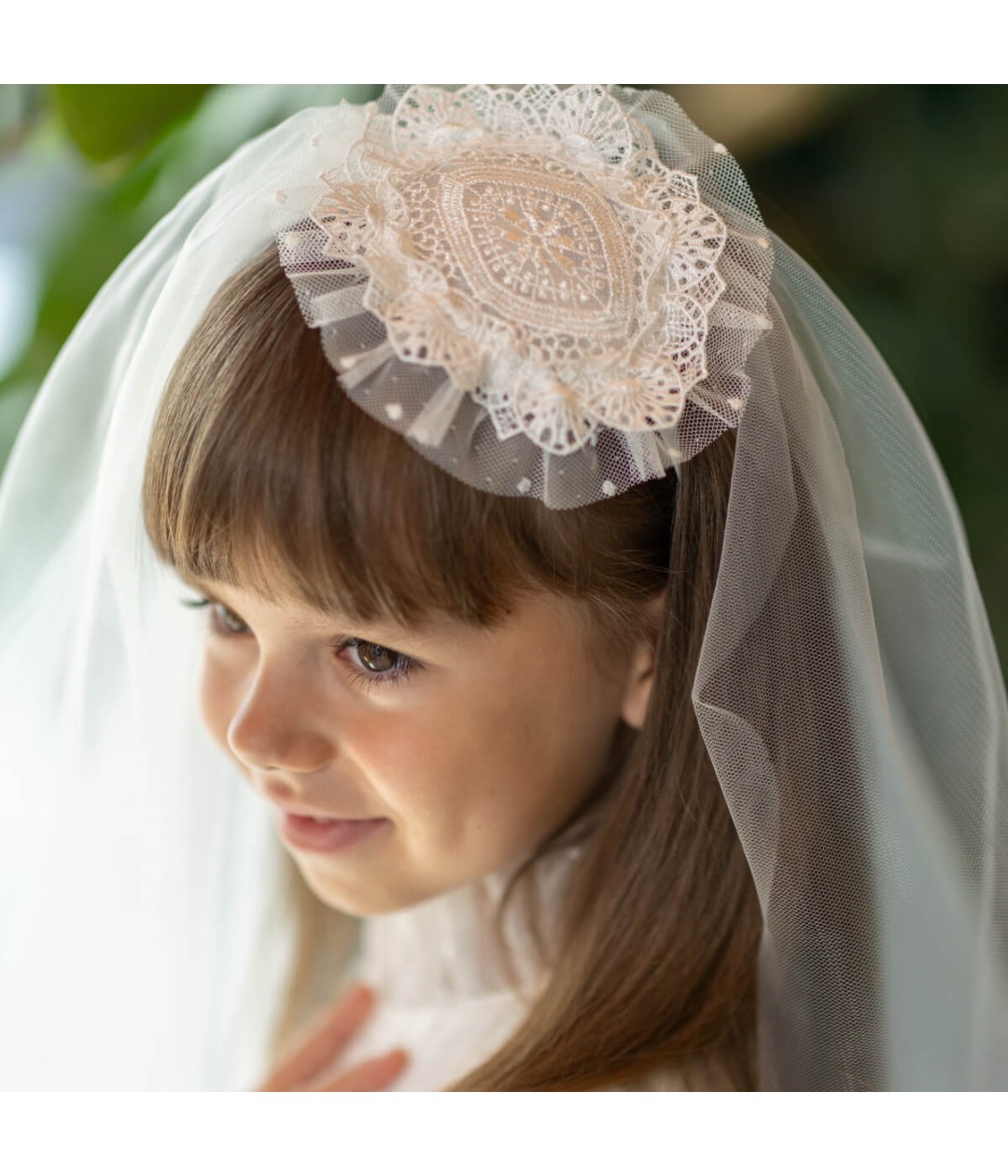 The veil drapes gracefully down the back, adding a touch of angelic elegance to any Communion dress. Crafted in ivory, it pairs perfectly with a variety of dress styles — whether classic, lace, or silk.