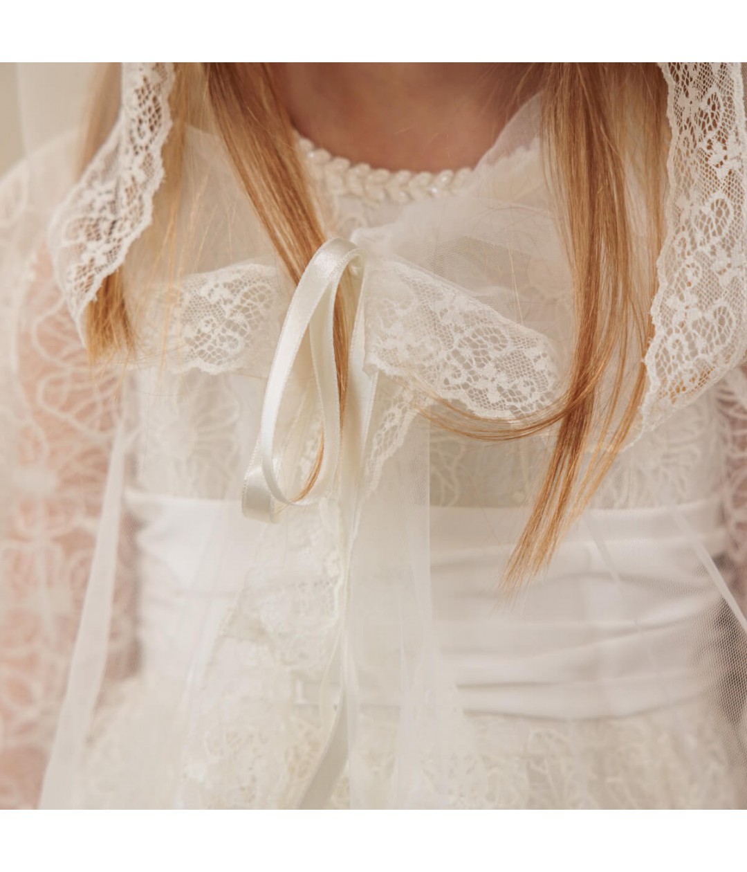 The classical caped design ensures a comfortable, elegant fit, while silk ties offer a secure and adjustable closure. Available in either white or ivory, the LONDON mantilla is designed to complement any Communion dress—adding a refined and polished finish to her special day.
