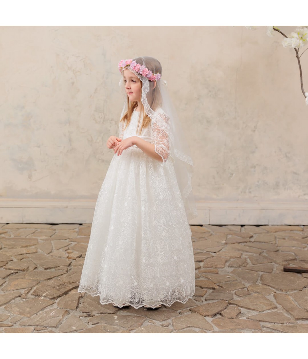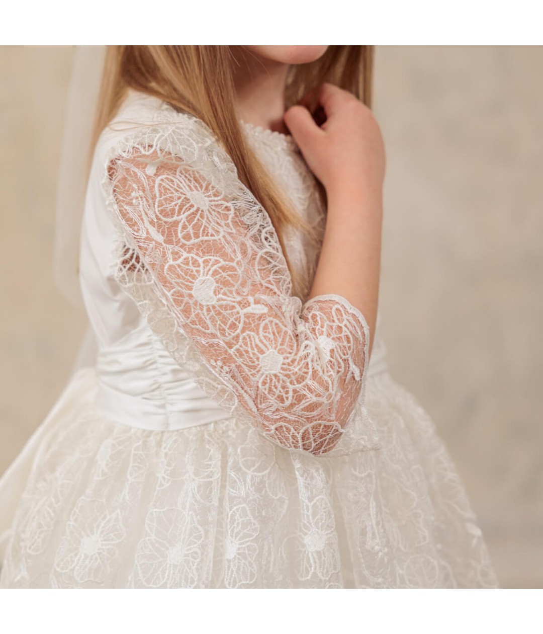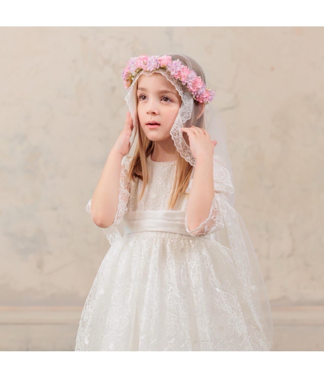 This exquisite ensemble combines traditional beauty with refined craftsmanship, designed especially for young girls receiving their First Holy Communion.