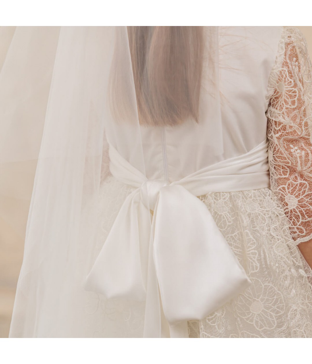 A 2/3 lace sleeve adds a modest and elegant touch, while the silk belt provides a gentle waist accent and can be tied to ensure the perfect fit. The back features a hidden zipper for easy dressing and a clean finish. Completing the look, the included flower wreath and coordinating veil are designed to match seamlessly—tied with silk ribbons under the hair for secure and graceful wear.