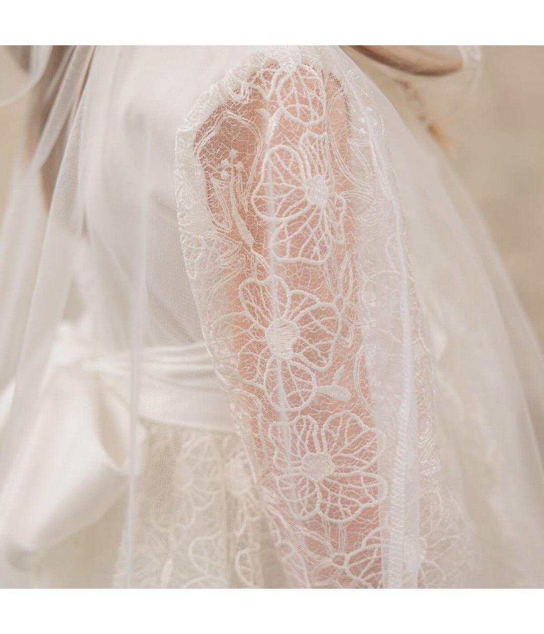 The LONDON dress is made from premium cotton and fully lined with the softest 100% cotton batiste, ensuring both comfort and breathability during church ceremonies and photos. Covered from top to bottom in delicate ivory lace with a floral motif, this dress brings vintage charm and graceful sophistication. The skirt features layers of fine tulle, creating a full, fluffy silhouette that moves beautifully with every step.