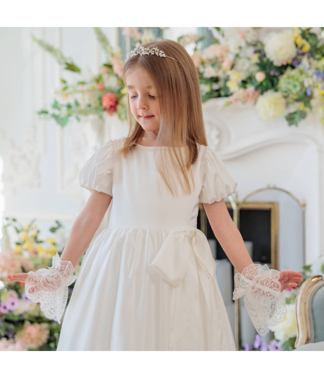 Celebrate her sacred milestone in timeless style with the MARIA Silk First Communion Dress. Crafted from luxurious pure Armani silk in a soft ivory hue, this dress radiates simple elegance and grace.