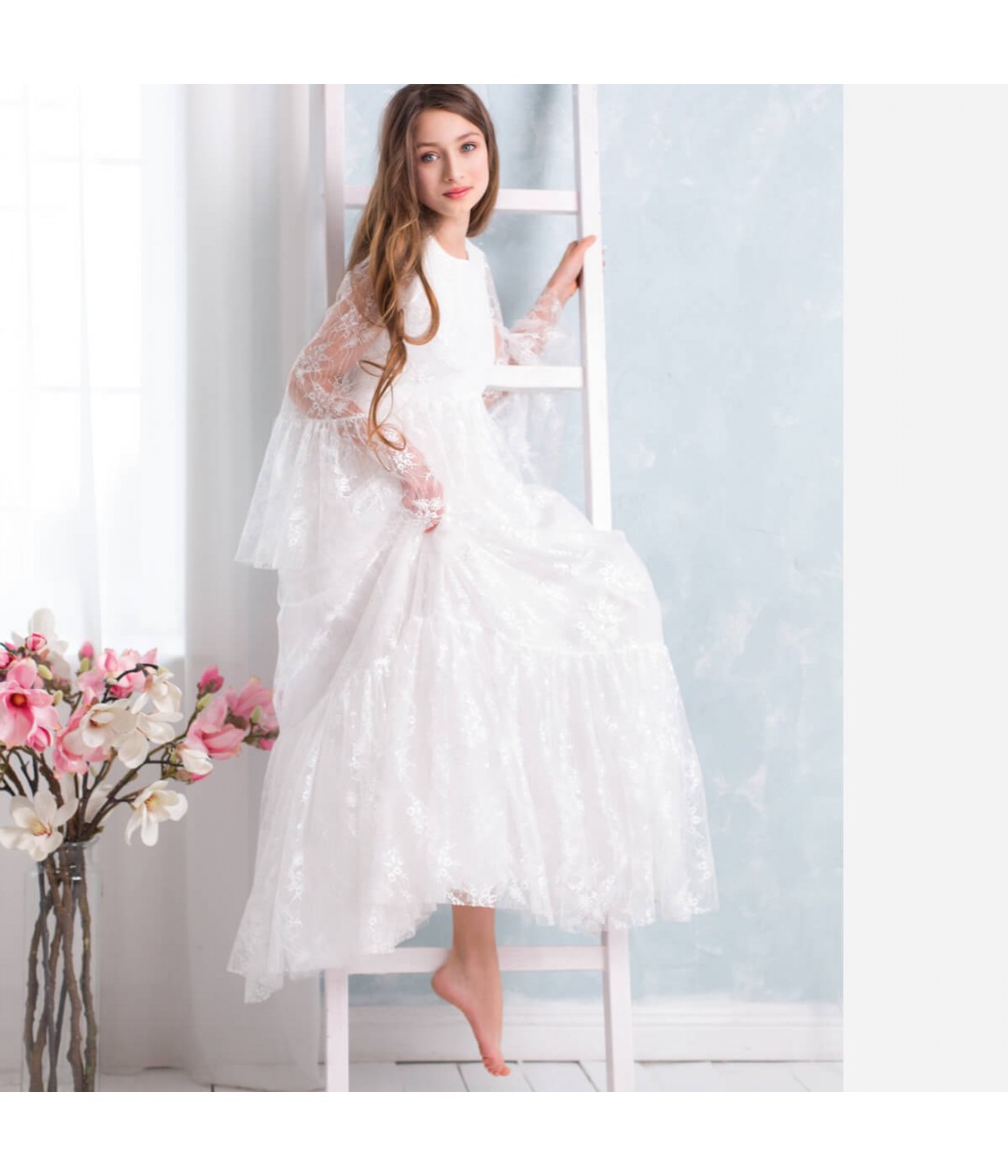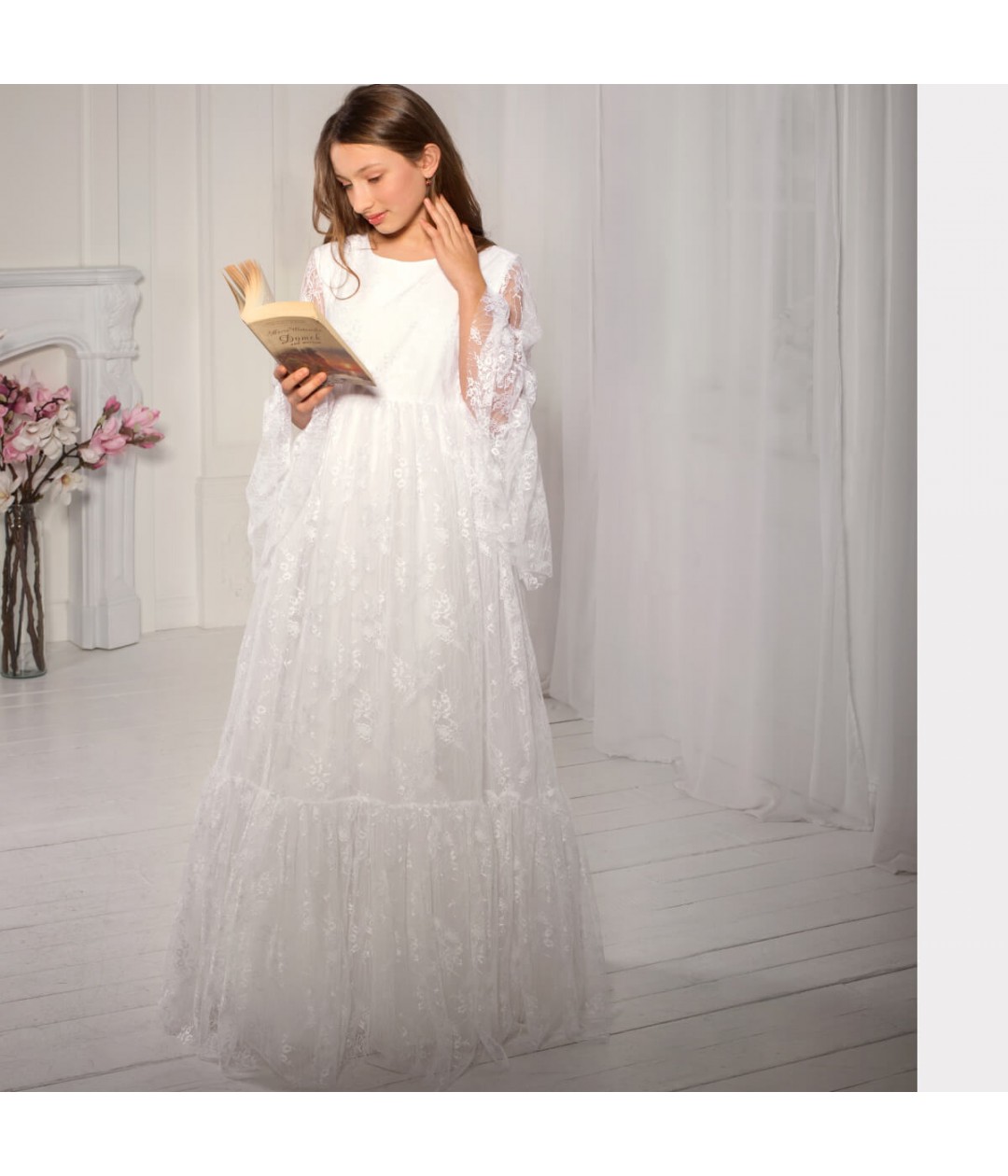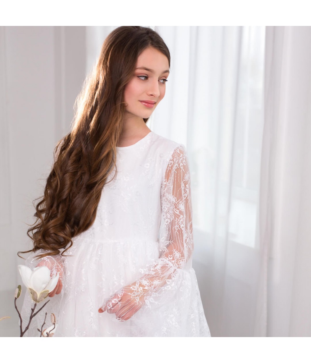 The MAYA First Communion Dress is a stunning piece crafted entirely from luxurious Italian Merletti lace, wrapping the entire dress in timeless elegance.