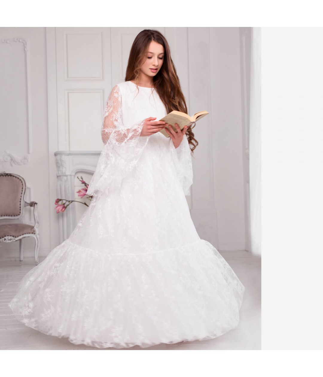 Designed in a soft ivory shade, it features delicate lace long sleeves and a beautifully full skirt, made voluminous with layers of soft tulle beneath.