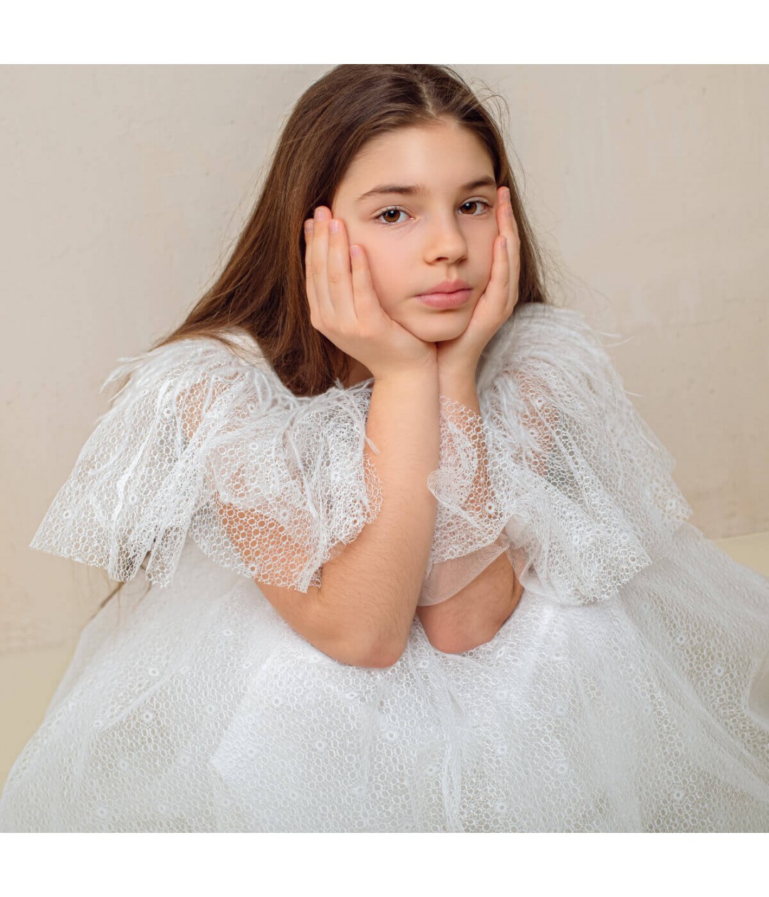 Make her First Communion unforgettable with this beautifully vintage-inspired gown. Crafted from the softest tulle in a flattering A-line silhouette, the dress offers both comfort and grace for her special day.