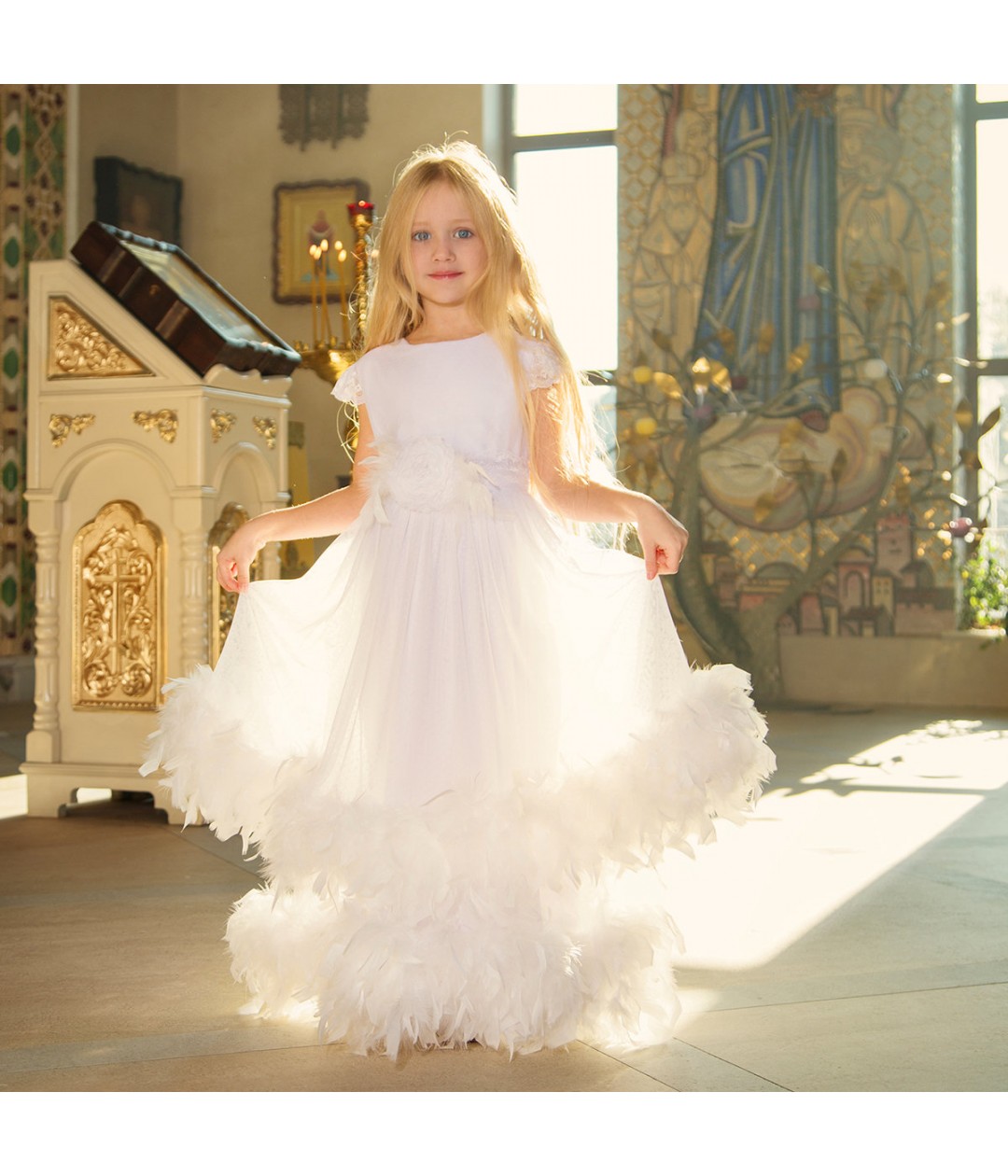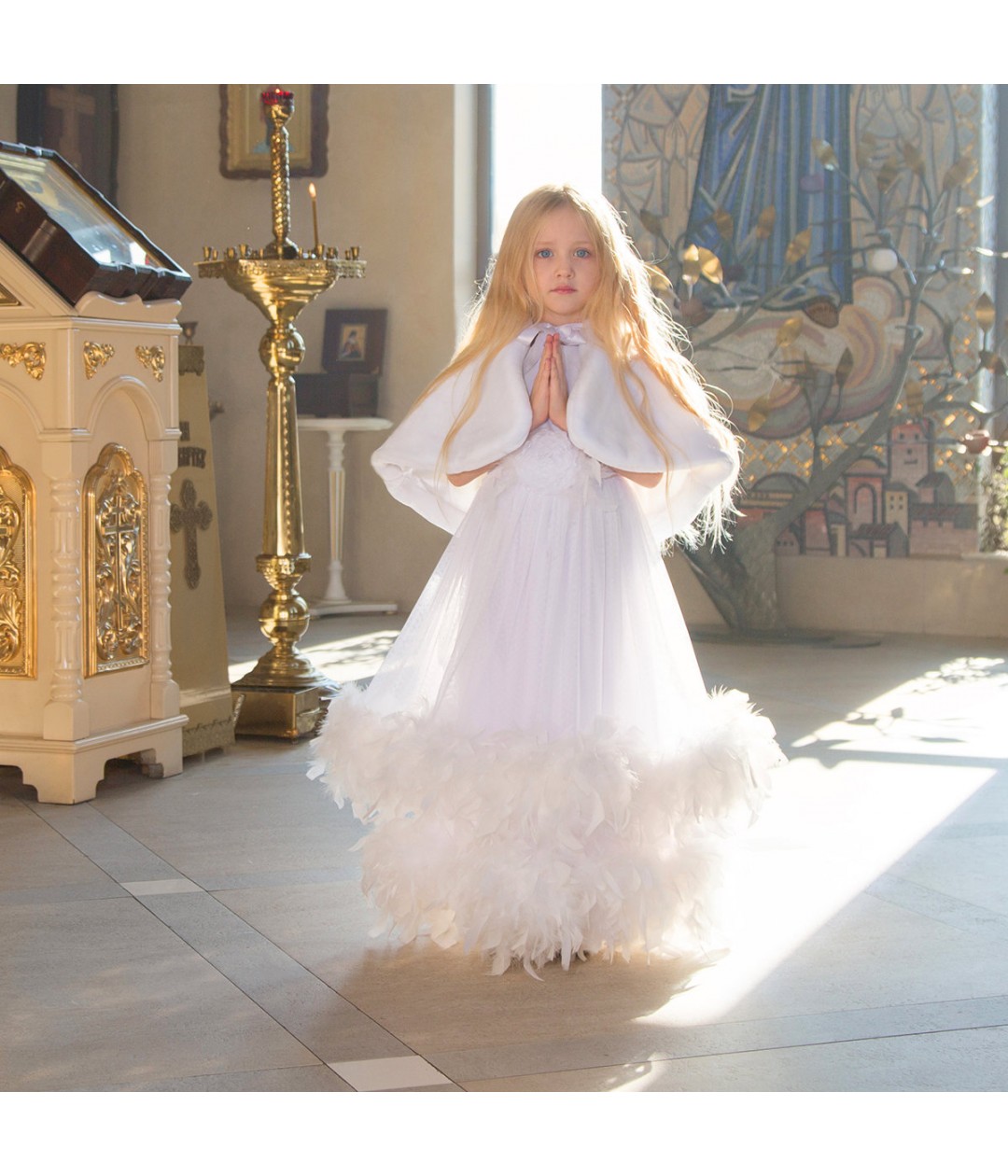 The MELODY Communion Dress stands out with a voluminous two-layered skirt adorned with luxurious white boa feather trim for a unique and stylish finish. The skirt flows gracefully to the floor, creating a stunning silhouette that’s both elegant and playful. The bodice features a clean, classic design, allowing the feathered skirt and lace details to shine. A long lace sash wraps around the waist, adding a romantic touch and adjustable comfort.