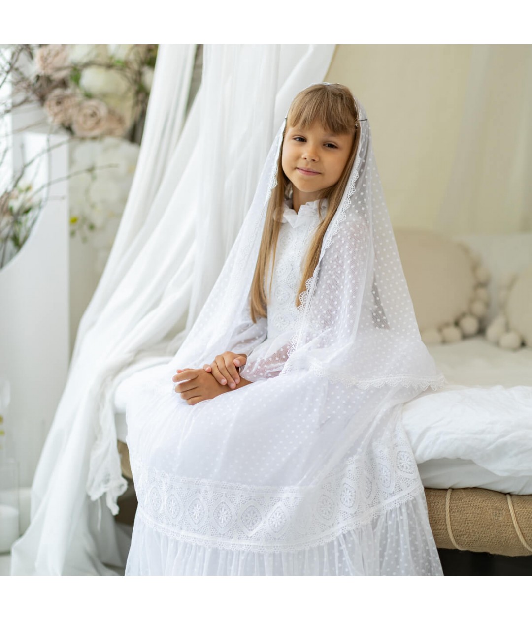 Celebrate her First Communion in timeless elegance with our Communion Veil, crafted in the classic mantilla style. Made from soft white polka dot tulle, this veil combines delicate texture with a refined, traditional look.
