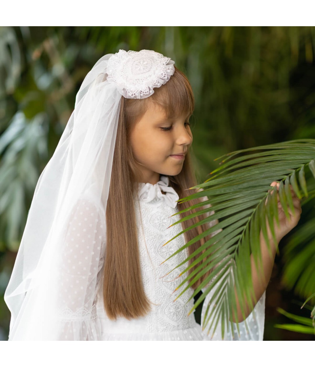 Complete her Communion look with the delicate charm of our Ivory Headband Communion Mantilla. This unique accessory features a thin headband covered in soft textile, offering a comfortable and secure fit throughout the ceremony.