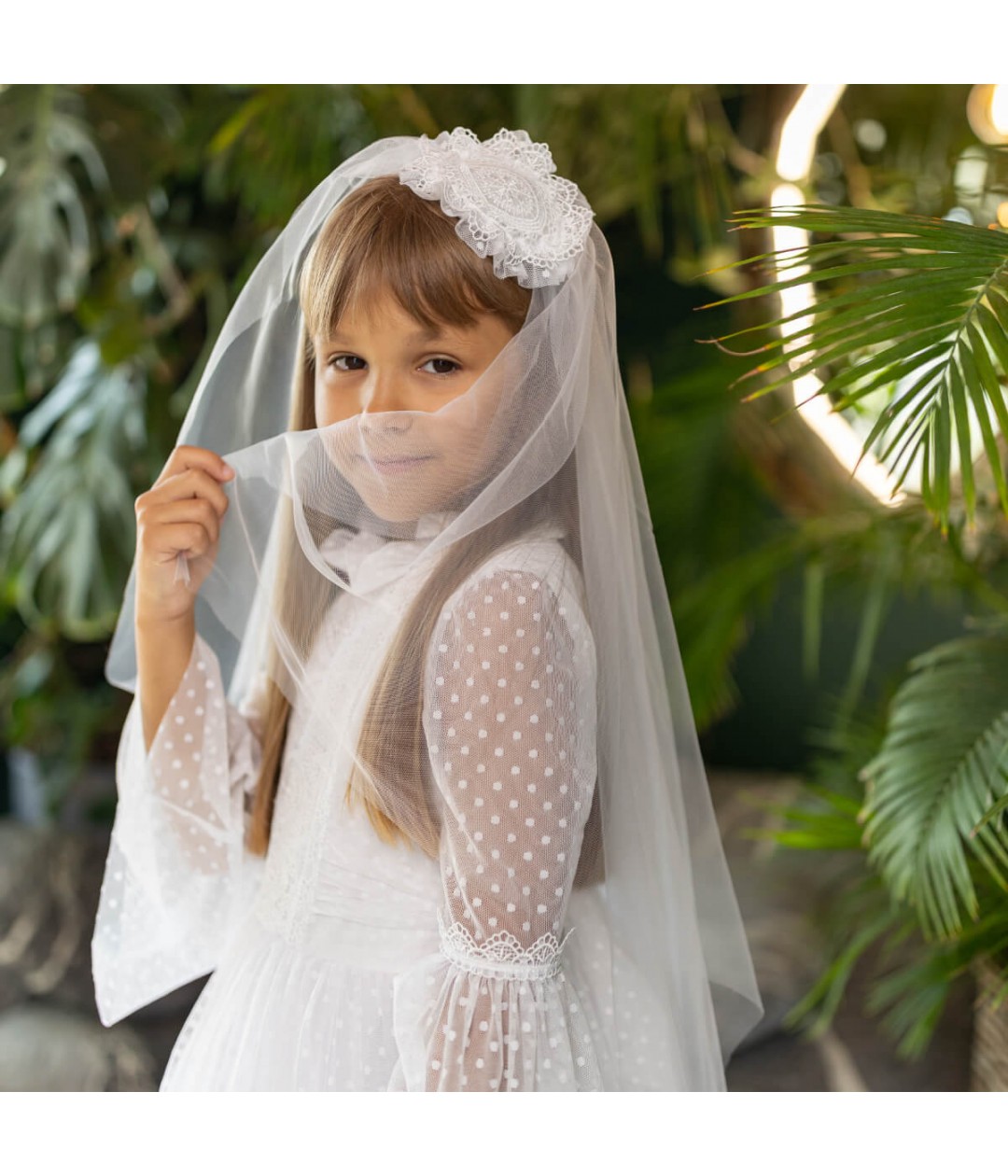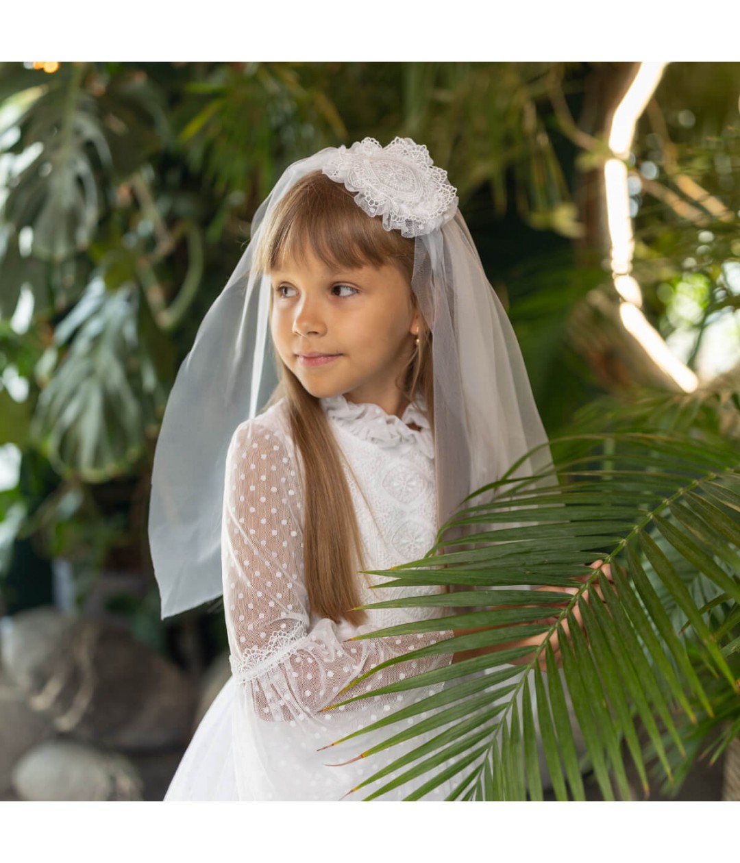 The headband is adorned with a charming lace decoration reminiscent of a petite hat, adding a sweet vintage-inspired touch. Flowing tulle softly drapes from the headband, creating an ethereal, classic look that complements any ivory Communion dress.