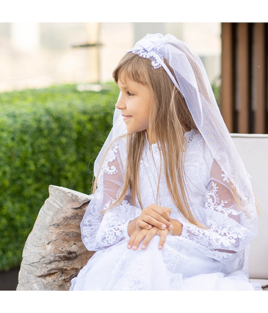 Perfectly versatile, this headband veil is available in both white and ivory, making it an ideal match for any Communion gown — from classic cotton to intricate lace. The lightweight construction ensures it stays comfortably in place throughout the ceremony.