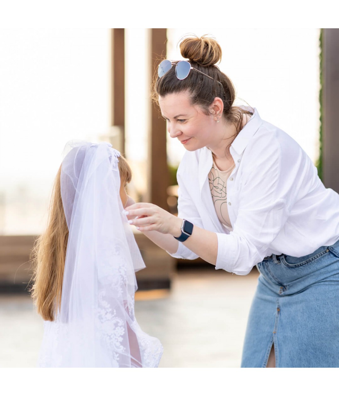— a charming and minimalistic accessory that suits any dress. The thin headband, covered in soft textile, is topped with a delicate lace accent and a flowing tulle veil. Its refined design provides a traditional touch without overwhelming her hairstyle or comfort.
