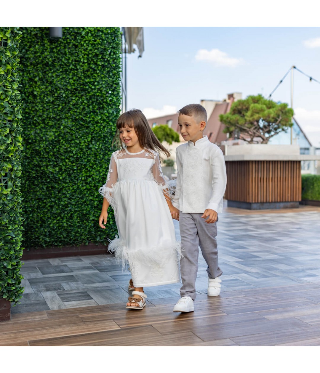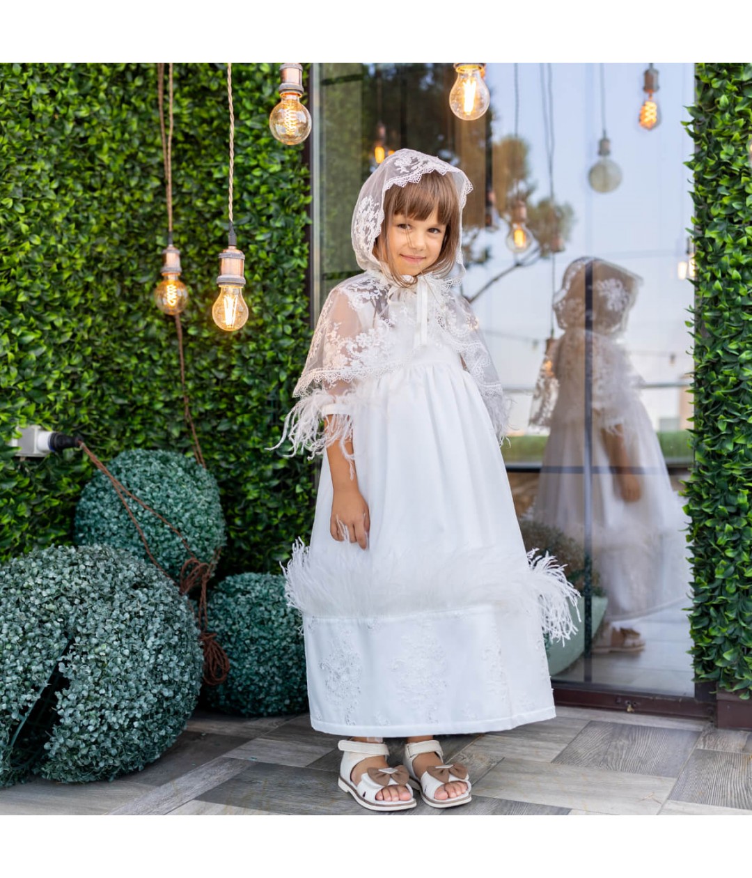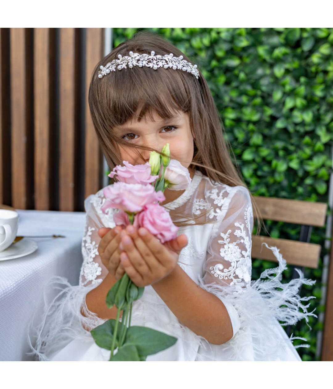 Designed in an elegant ivory shade, the PRISCILLA dress is ideal for parents looking for a luxurious, fashion-forward Communion outfit that still honors tradition.