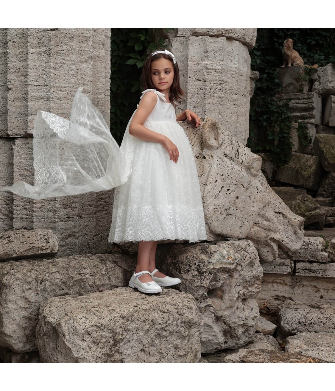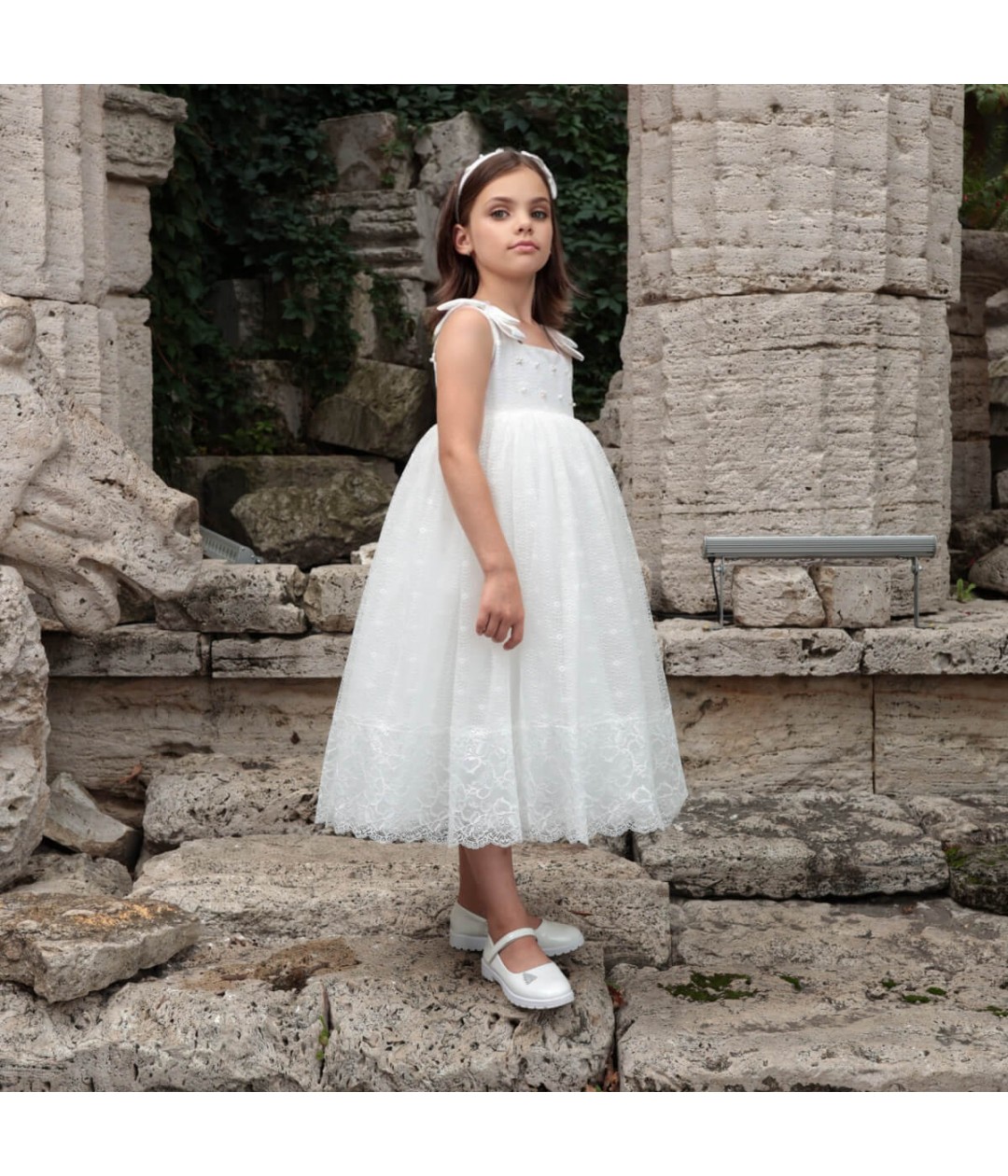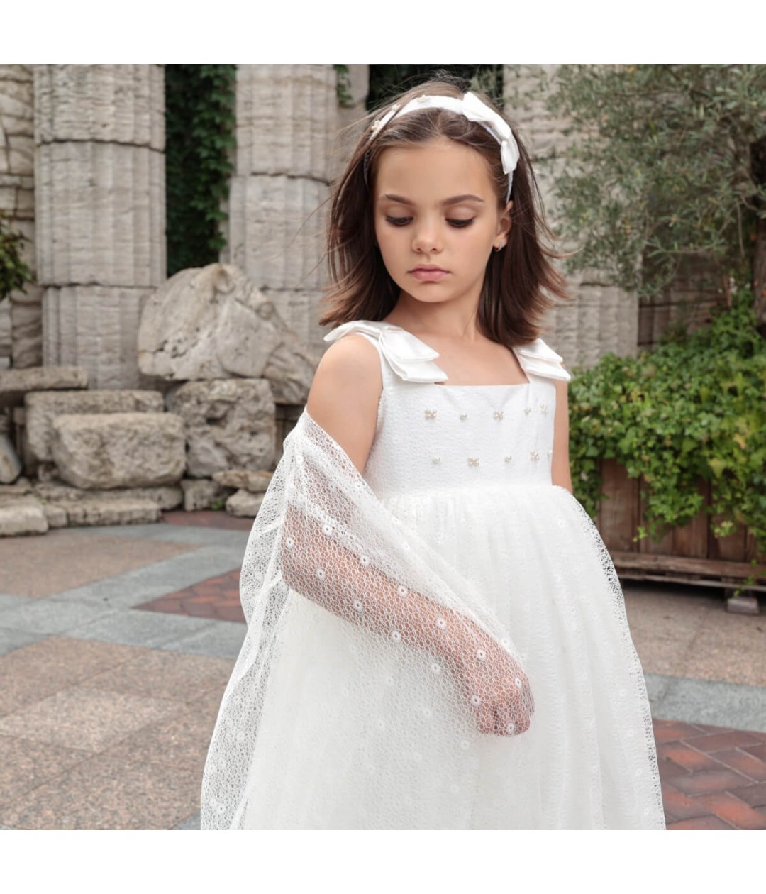 On top, satin bows and pearl embellishments grace the shoulders, making this dress a picture-perfect choice for flower girls and little guests of honor.