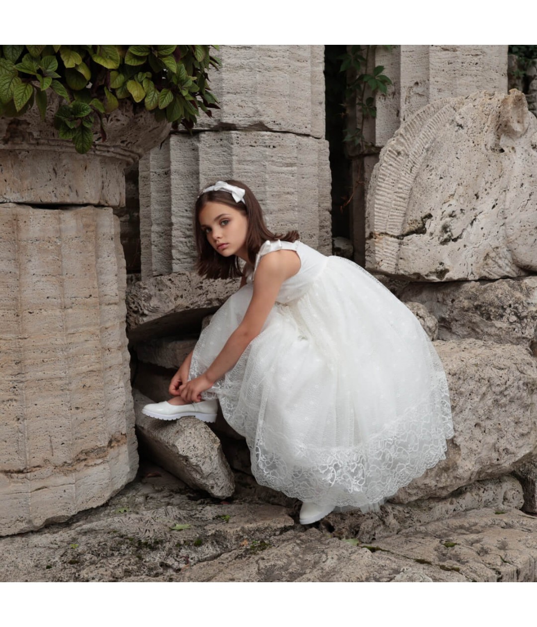 The fluffy tulle skirt adds volume and grace, while delicate lace trim along the hem enhances its timeless charm.