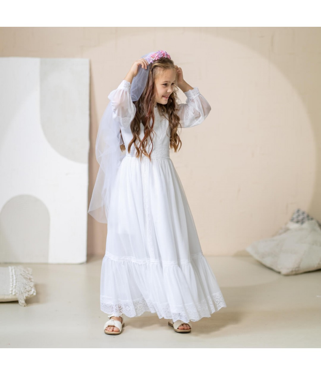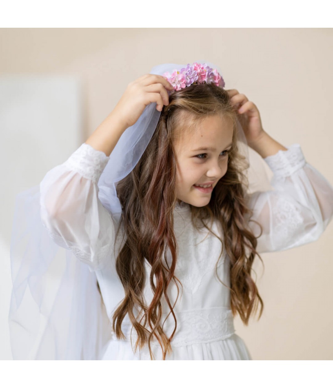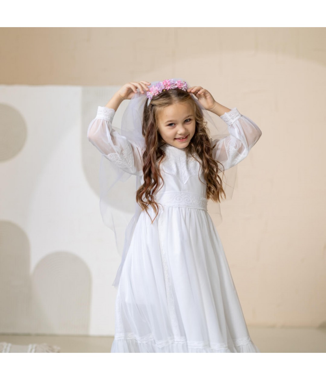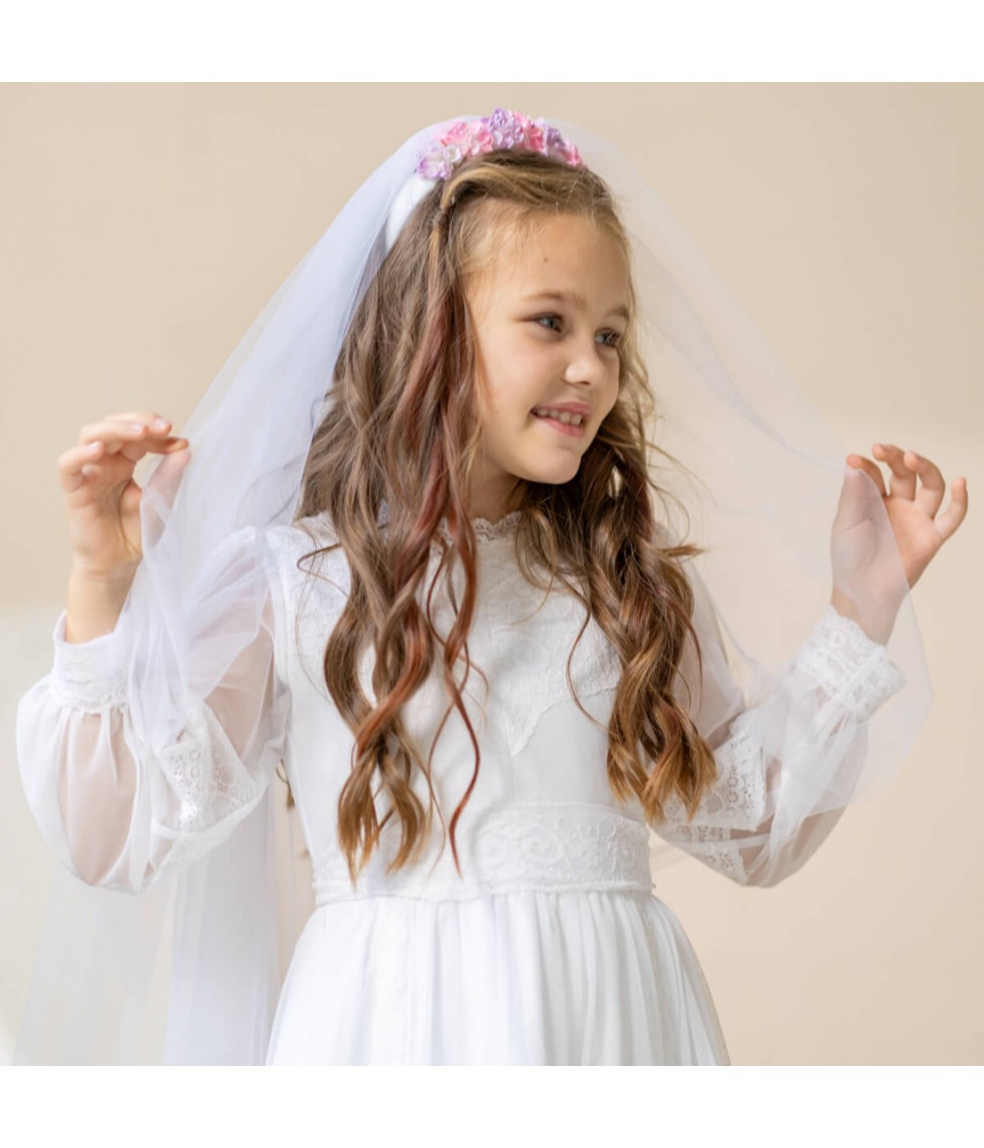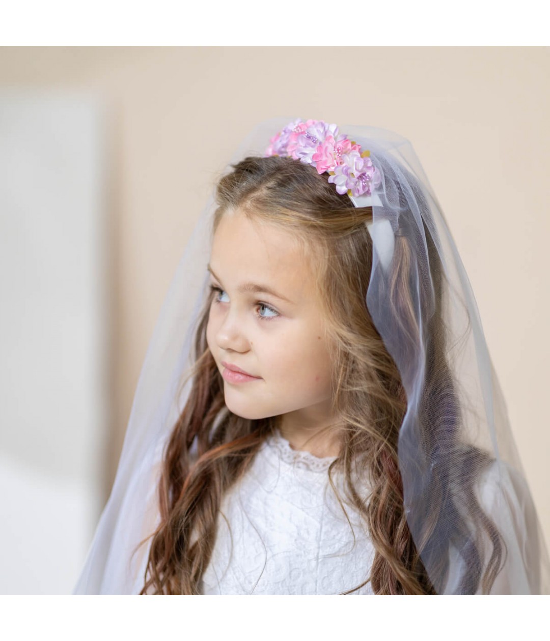 Add a touch of timeless charm to her Communion or special occasion look with the SARAH Girl Veil Flower Crown. This elegant accessory combines the softness of light pink flowers with a flowing, ethereal veil, creating a sweet and sophisticated style she’ll cherish.