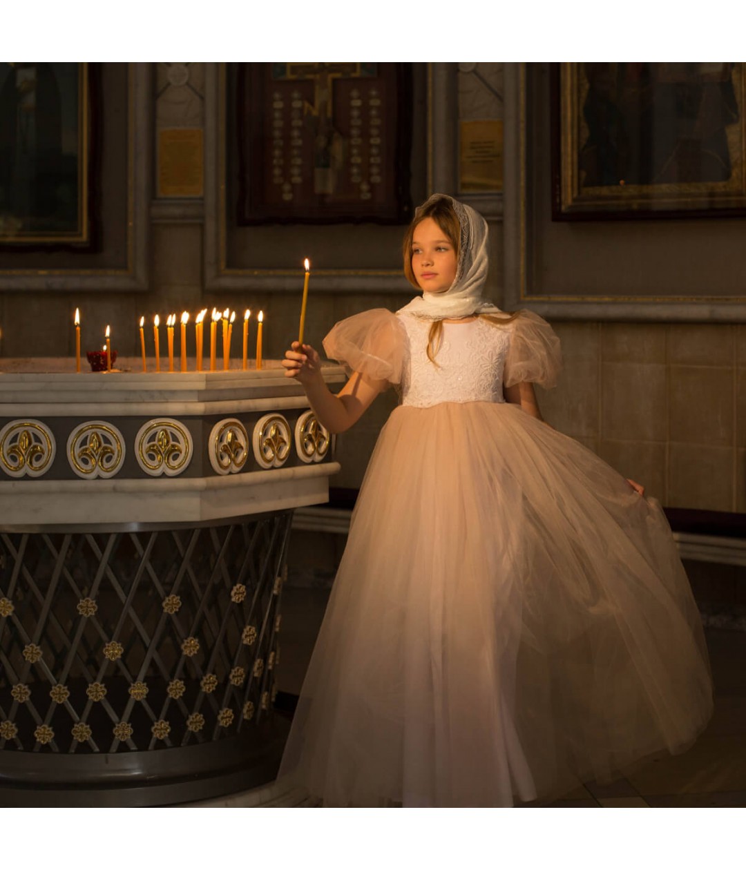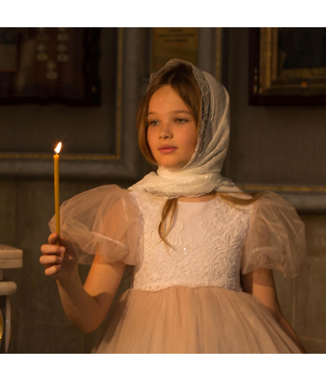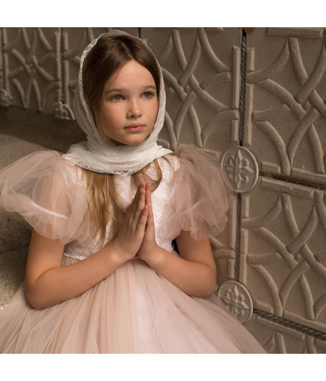 offers timeless beauty in a delicate triangle-shaped design, perfect for First Communion or traditional church ceremonies. Crafted from the softest designer tulle and available exclusively in elegant ivory, this veil is both classic and graceful.