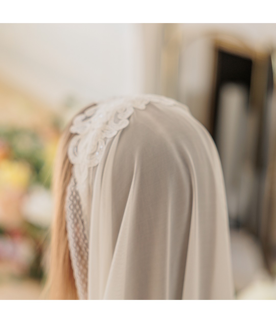 This timeless accessory features a comfortable headband wrapped in soft textile, beautifully adorned with delicate lace and hand-sewn beads for an extra special touch.